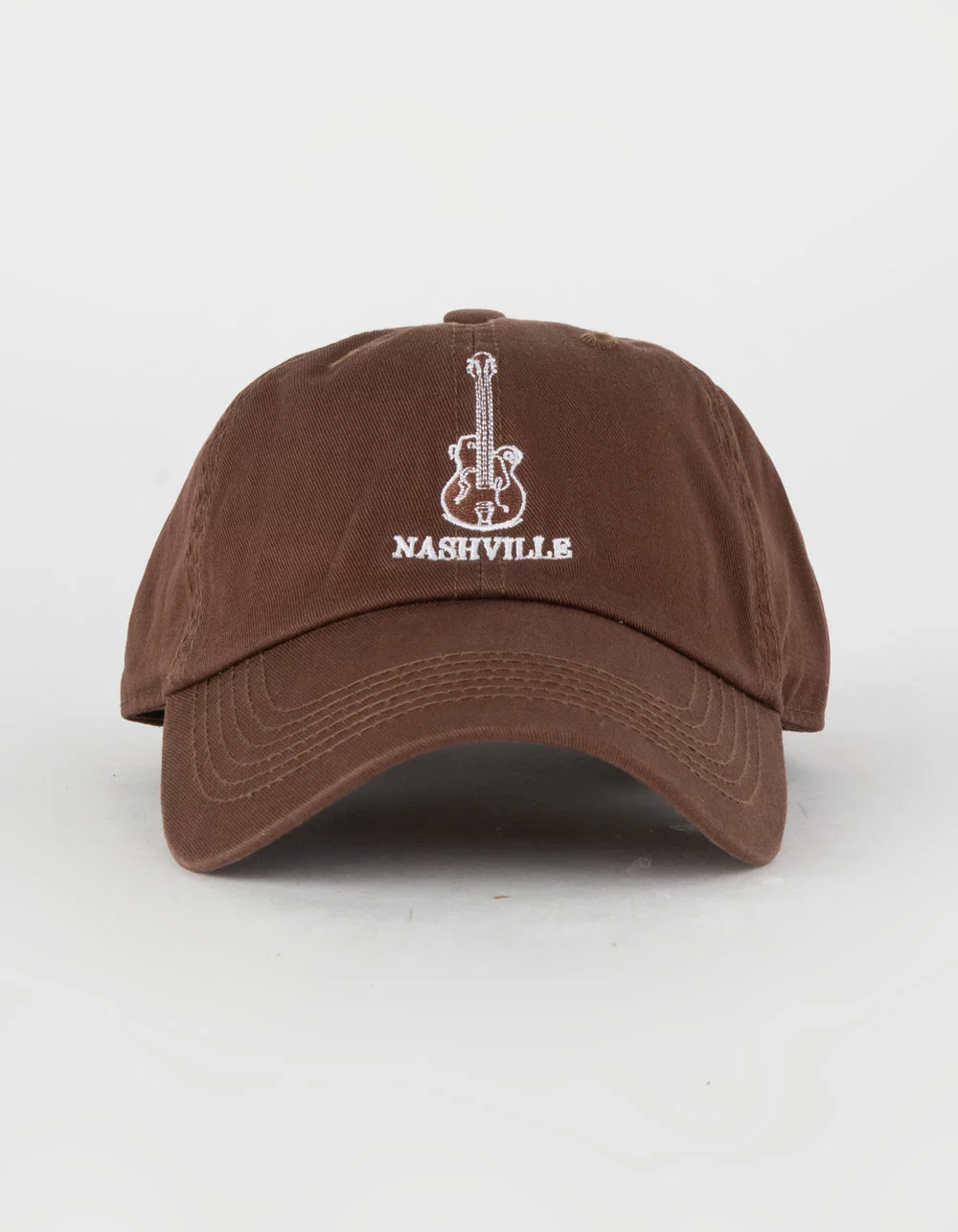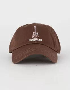 Nashville Guitar Dad Cap Strapback Hat. Embroidery on front. Curved visor. Adjustable strapback with brass buckle. 100% Cotton. Imported.