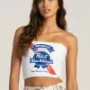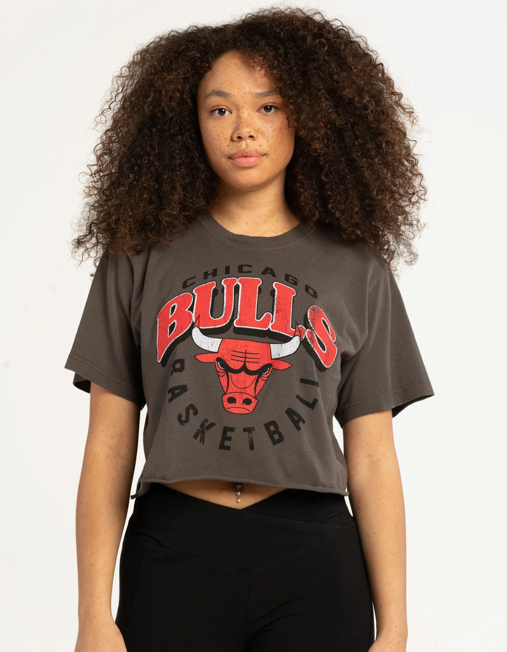 Chicago Bulls Crop Tee. Large graphic screened on front. Ribbed crew neckline. Short sleeve. Boxy and cropped fit. Raw edge hem. NBA officially licensed. 100% Cotton. Machine wash. Imported.