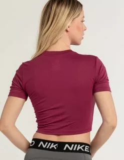 Nike Sportswear Essential Slim Crop Tee. Embroidered Nike swoosh logo on center chest. Ribbed crew neckline. Short sleeve. Slim fitting, cropped fit. 49% Polyester, 48% Modal, 3% Spandex. Machine wash. Imported.