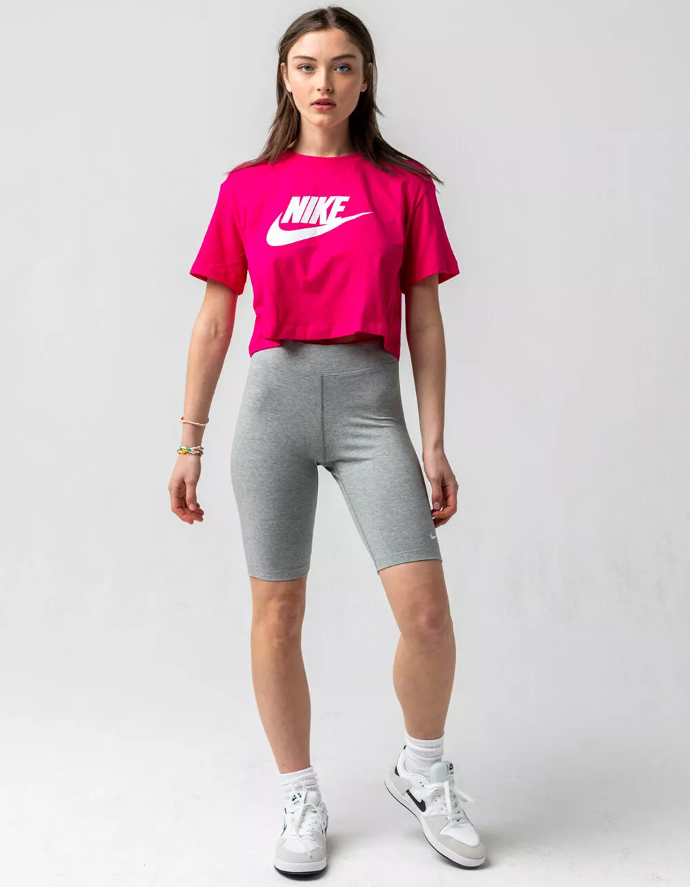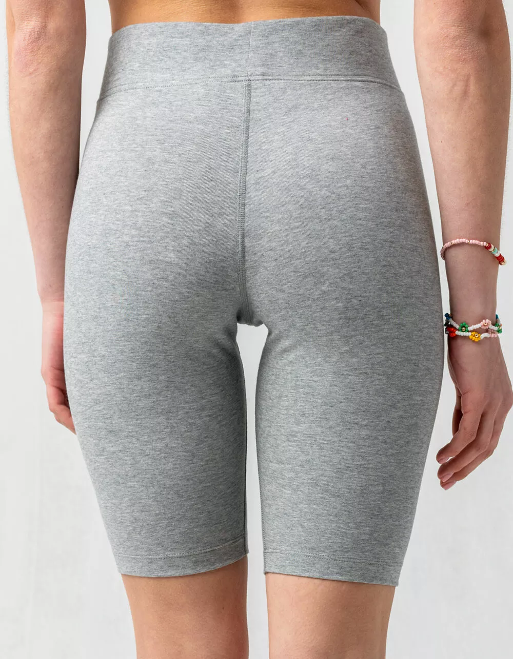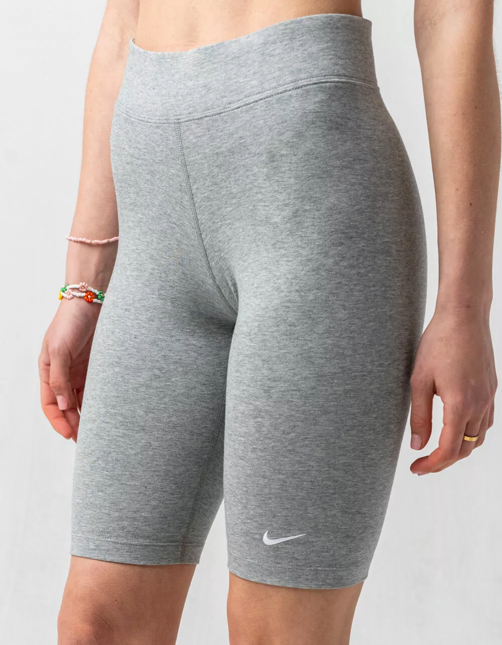 Nike Sportswear Essential Biker Shorts. The Nike Sportswear Bike Shorts update a favorite retro style with a mid-rise design and a snug stretch waistband. Stretchy, sweat-wicking fabric and a Swoosh logo make these an easy choice for everyday wear. A contoured mid-rise design offers a comfortable fit that sits just below your belly button. Tight fit for a body-hugging feel. Approx. inseam: 10″. 61% cotton/33% polyester/6% spandex. Machine wash. Imported.