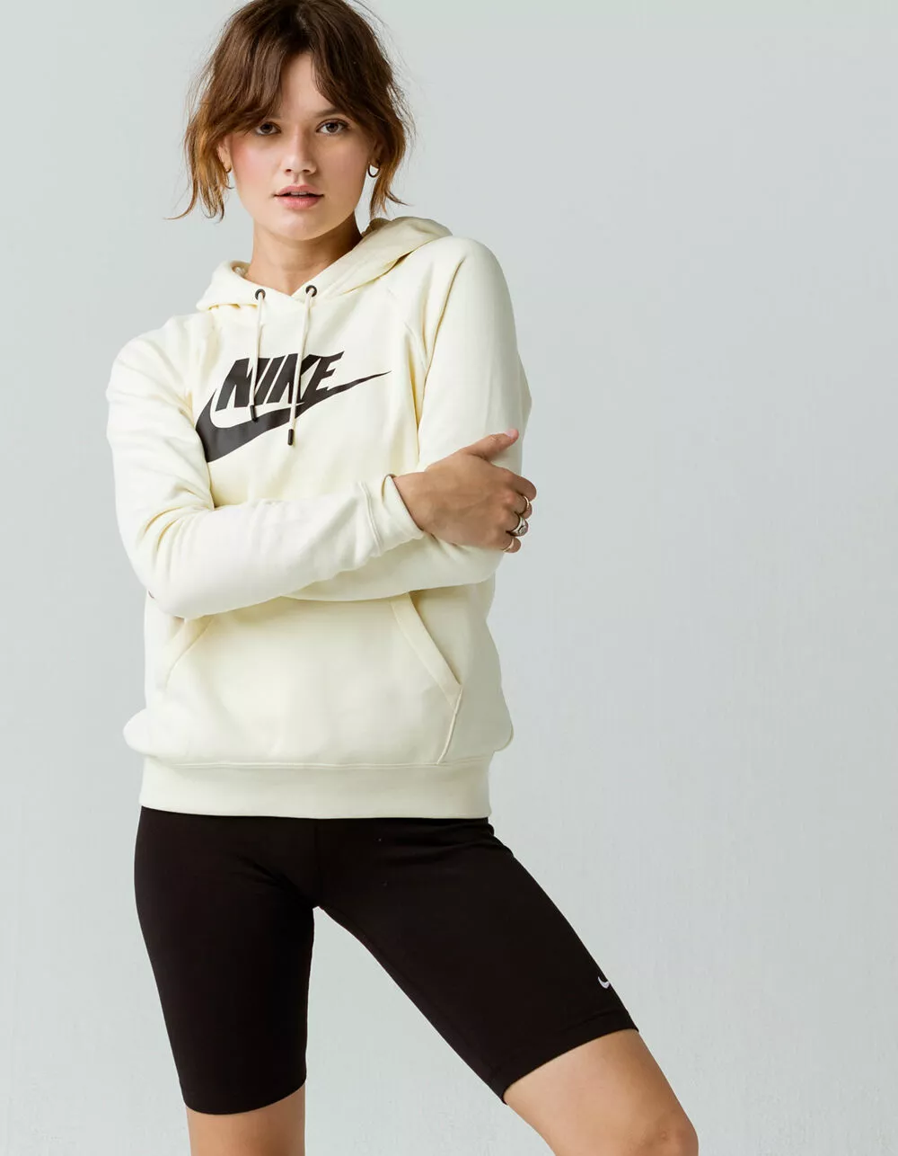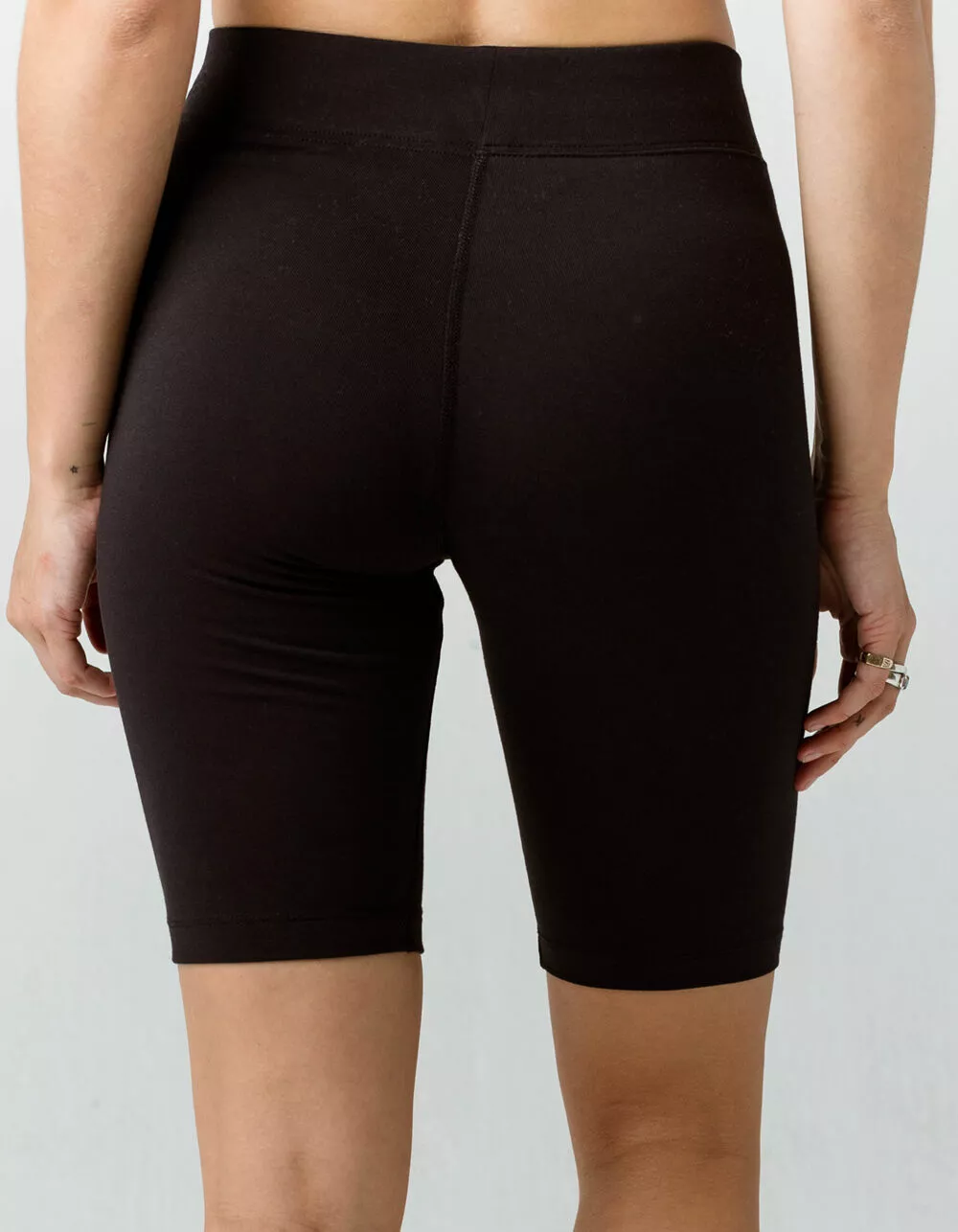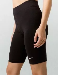 Nike Sportswear Essential Biker Shorts. The Nike Sportswear Bike Shorts update a favorite retro style with a mid-rise design and a snug stretch waistband. Stretchy, sweat-wicking fabric and a Swoosh logo make these an easy choice for everyday wear. A contoured mid-rise design offers a comfortable fit that sits just below your belly button. Tight fit for a body-hugging feel. 61% cotton/33% polyester/6% spandex. Machine wash. Imported.