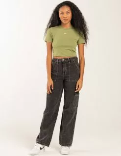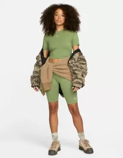 Nike Sportswear Essential Crop Tee. Made to pair with your favorite shorts and leggings, the Nike Sportswear Essential Crop Top is a go-to styling piece with a body-skimming fit and embroidered graphic. A soft and stretchy blend fabric promotes natural movement. Slim fit for a tailored feel. 49% Modal 49% Polyester 2% Spandex. Machine wash. Imported.