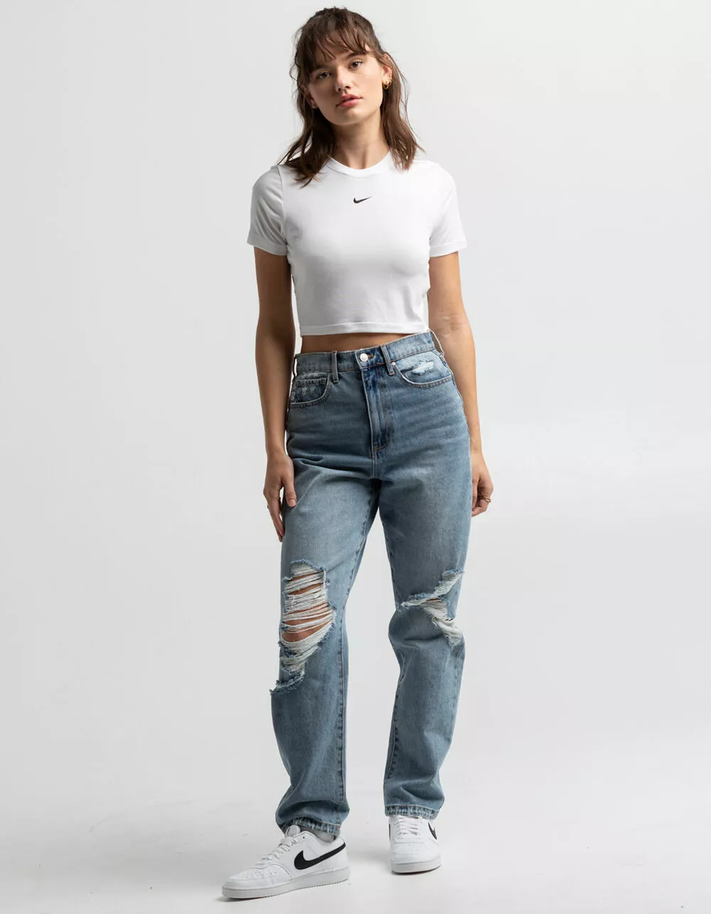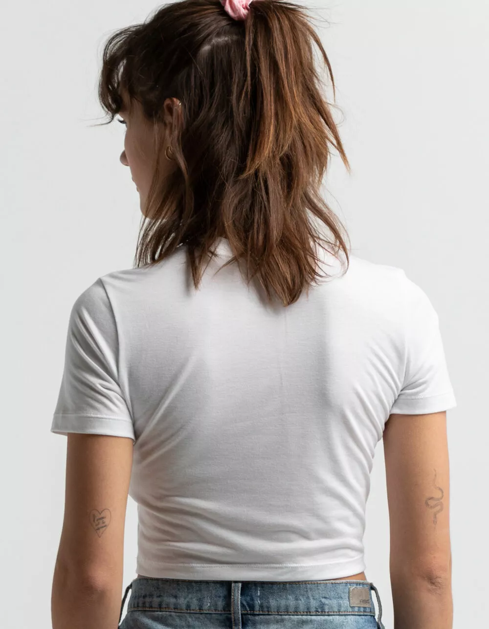 Nike Sportswear Essential Slim fit Crop Tee. Ribbed crew neckline. Short sleeves. Crop hem. Logo embroidered at center chest. 49% Modal 49% Polyester 2% Spandex. Machine wash. Imported.