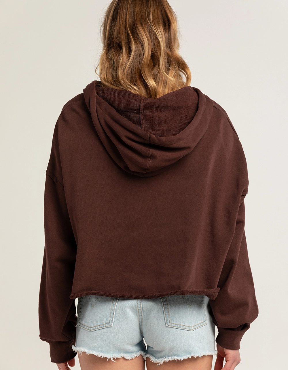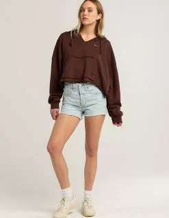 Nike Sportswear Everyday Crop Hoodie. Raw edge V-neck. Embroidered Nike swoosh logo on left chest. Drawstring hood. Kangaroo pocket. Cuffed long sleeves. Raw edge hem. Cropped. Oversized fit. 80% Cotton, 20% Polyester. Machine wash. Imported.