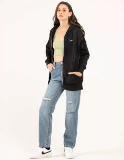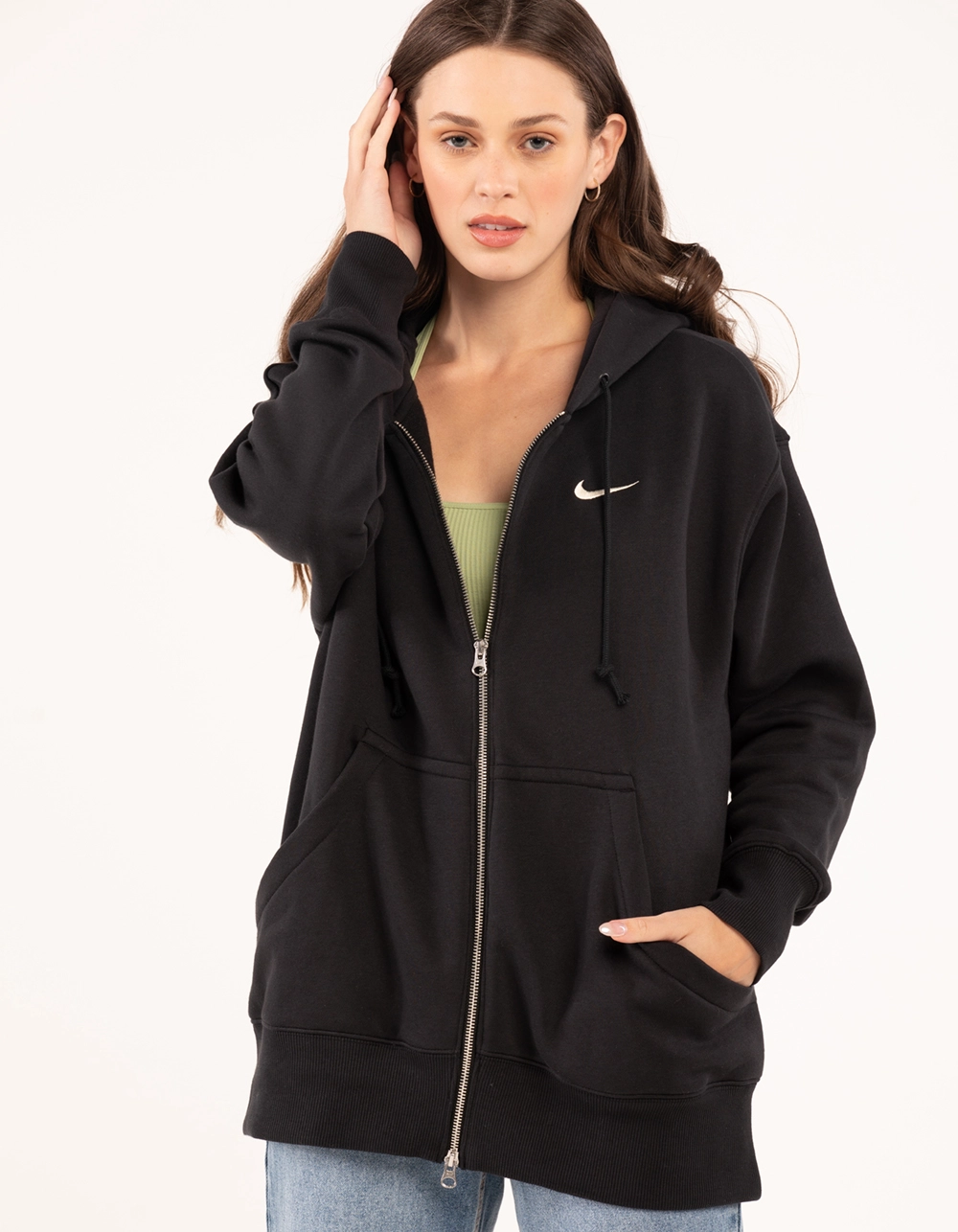 Nike Sportswear Phoenix Fleece Oversized Zip-Up Hoodie. Embroidery screened at the left chest. Phoenix fleece lining. Drawstring hood. Front pocket pouch. Cuffed long sleeves and hem. Oversized fit. 80% Cotton 20% Polyester. Machine wash. Imported.
