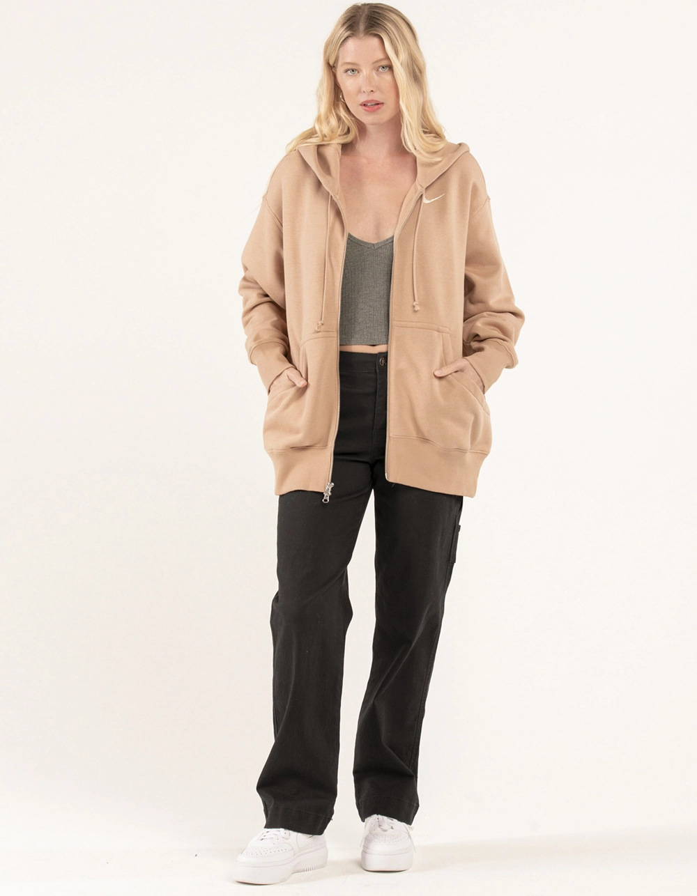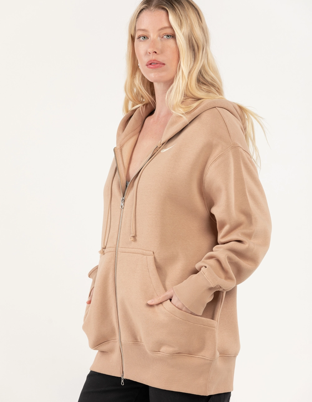 Nike Sportswear Phoenix Fleece Oversized Zip-Up Hoodie. Rise up and transform your fleece wardrobe with strong cozy vibes. This full-zip Phoenix Fleece hoodie’s spacious fit keeps you relaxed and comfy while exaggerated details (like extra-tall ribbing and an oversized front pocket) add a bold look, helping you stand out. Smooth on the outside and cozy on the inside, brushed fleece is our go-to sweatshirt material for colder temperatures. Elongated ribbing at the cuffs and hem provides extra comfort and structure. 4-panel hood adds a clean, premium look. Full-length zipper provides styling and fit options. Embroidered Swoosh logo. Extra-long drawcord. 3-panel hood. 80% cotton/20% polyester. Hood lining: 100% cotton. Machine wash. Imported.