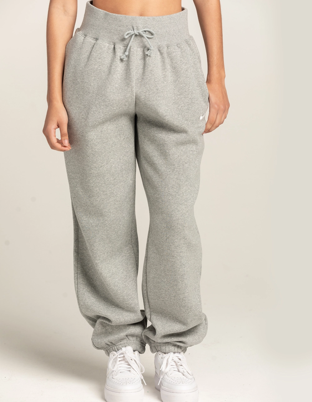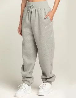 Nike Sportswear Phoenix Fleece Womens Sweatpants. Rise up and transform your fleece wardrobe with strong cozy vibes. These oversized Phoenix Fleece sweats have extra room in the legs for a fit that’s comfy and relaxed. The taller ribbed waistline sits higher on your hips for a stay-put, snug feel and a bold look. Embroidered Swoosh logo. Side pockets. Braided drawcord. 80% cotton/20% polyester. Machine wash. Imported.
