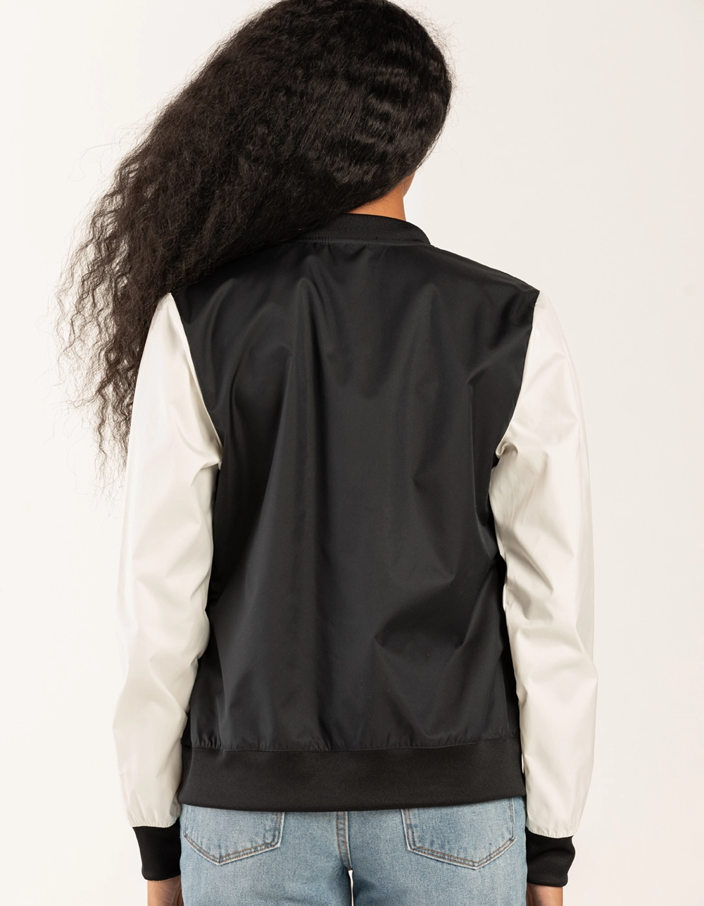 Nike Womens Varsity Jacket. Patch on left chest. Stretch-rib collar with matching cuffs and hem. Button front. Welt side pockets. Body: 100% Polyester. Rib: 98% Polyester, 2% Spandex. Machine wash inside out. Imported.