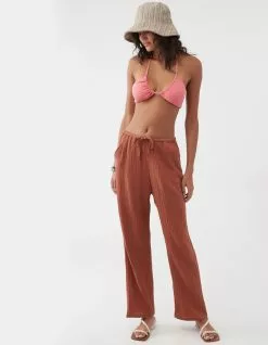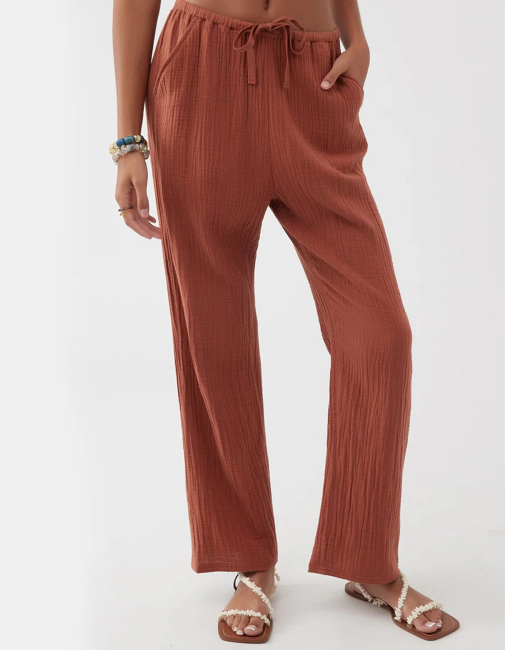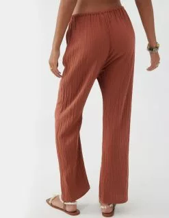 O’Neill Brenda Pants. Cute and casual woven pants that have a wide leg fit, elastic waist with drawcord and soft, comfortable feel. 26″ inseam. 12 1/4″ front rise. Front hip pockets. 100% Cotton. Machine wash. Imported.