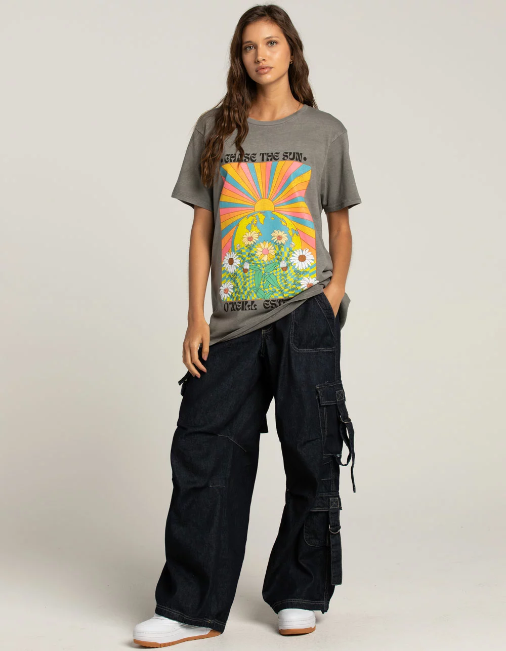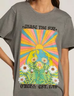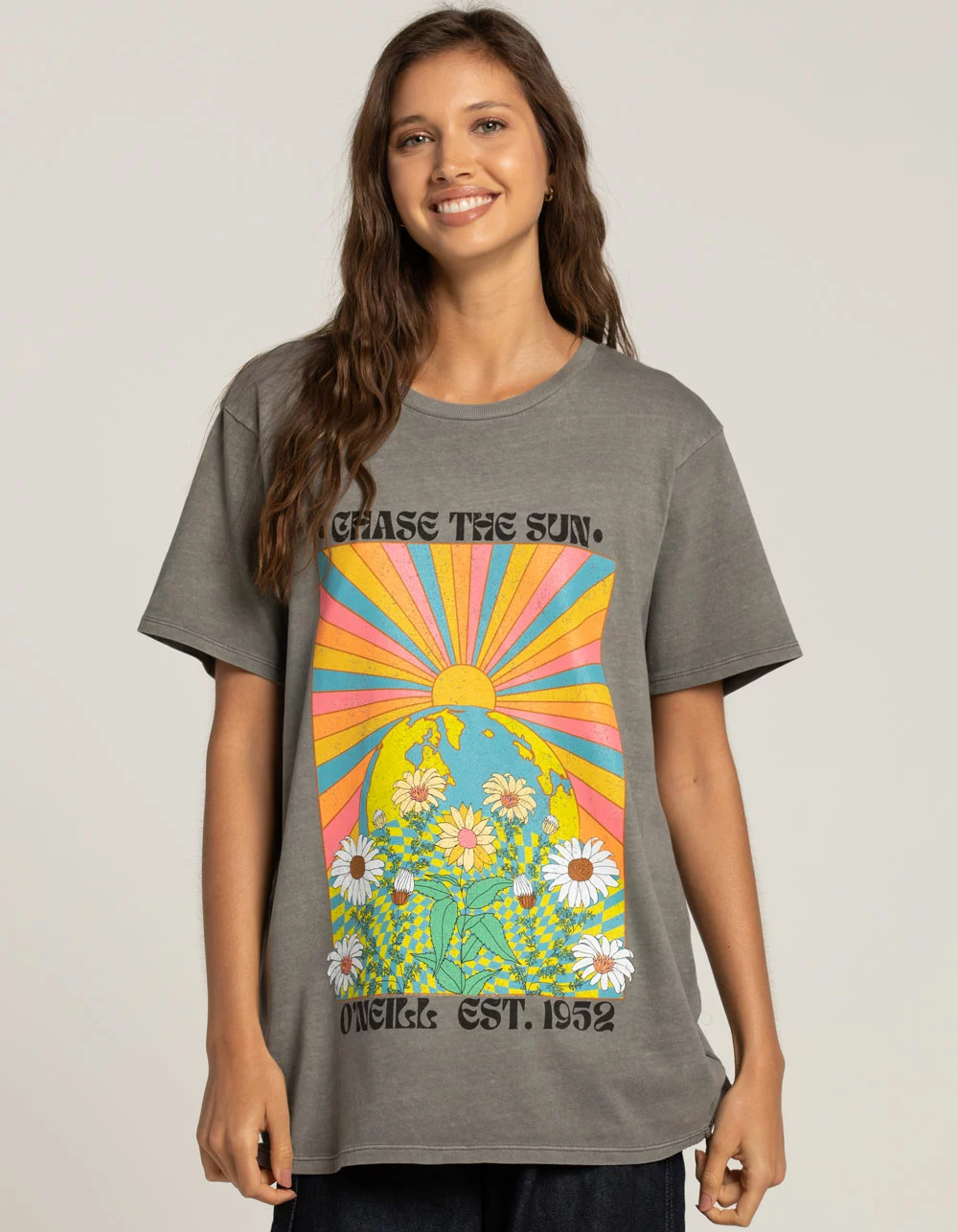 O’Neill Chase The Sun Oversized Tee. This is an oversized fit, soft cotton tee that has a garment dye design and high quality screen print. Ribbed crew neckline. Short sleeve. 100% Cotton. Machine wash. Imported.