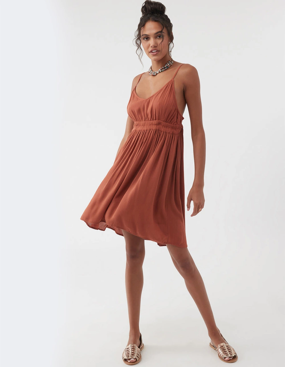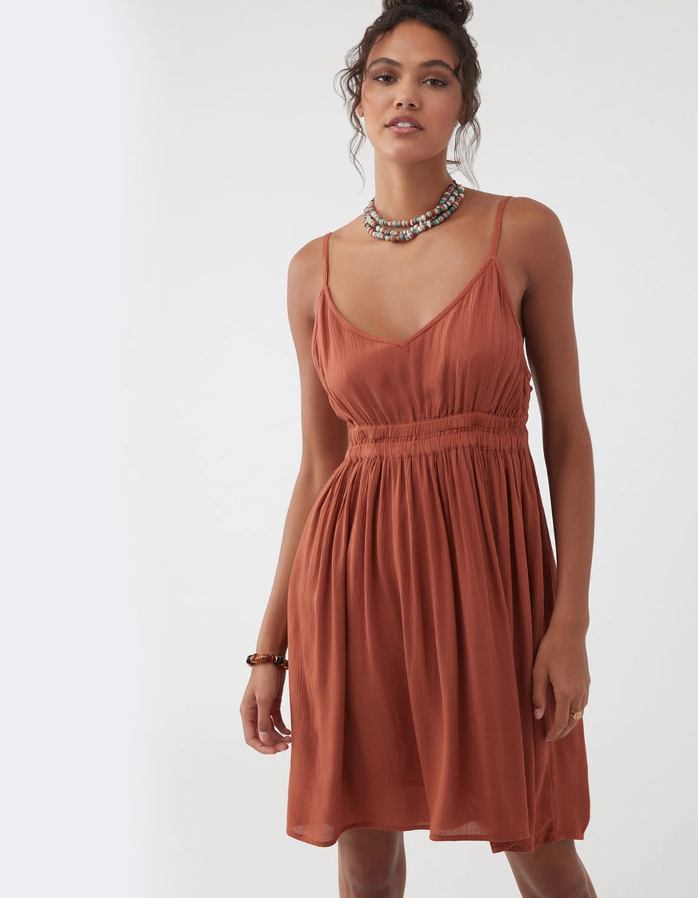 O’Neill Kenzie Mini Dress. Essential woven mini dress that fits and flows with the body effortlessly. It features a solid color design, waist shirring detail and adjustable straps. 29.5″ in length. Waist shirring detail. Lined. Solid color wash. 100% Viscose. Imported.