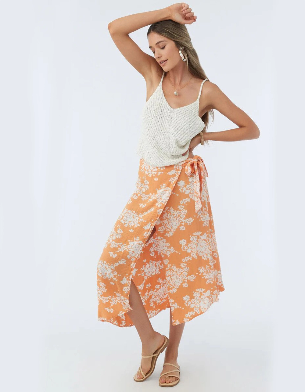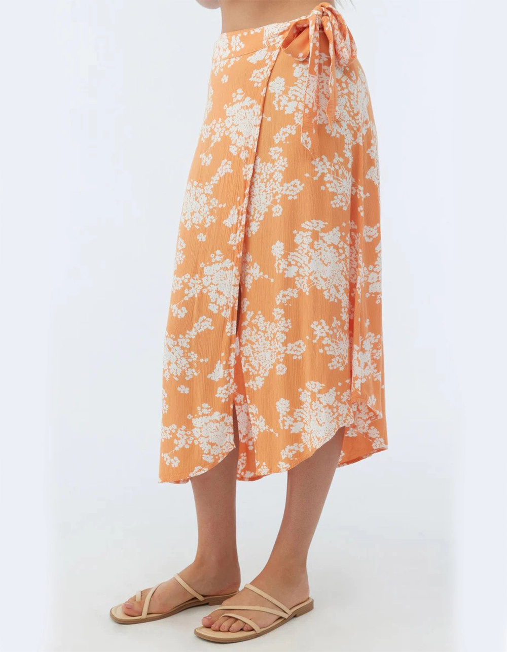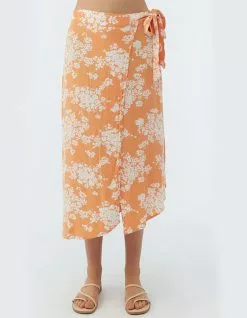 O’Neill Lena Midi Skirt. Colorful and flowy midi skirt that has a front wrap design, asymmetrical hem detail and ties at the waist. 30″ In length. 100% Viscose crinkle. Machine wash. Imported.