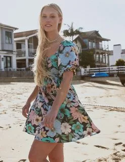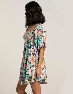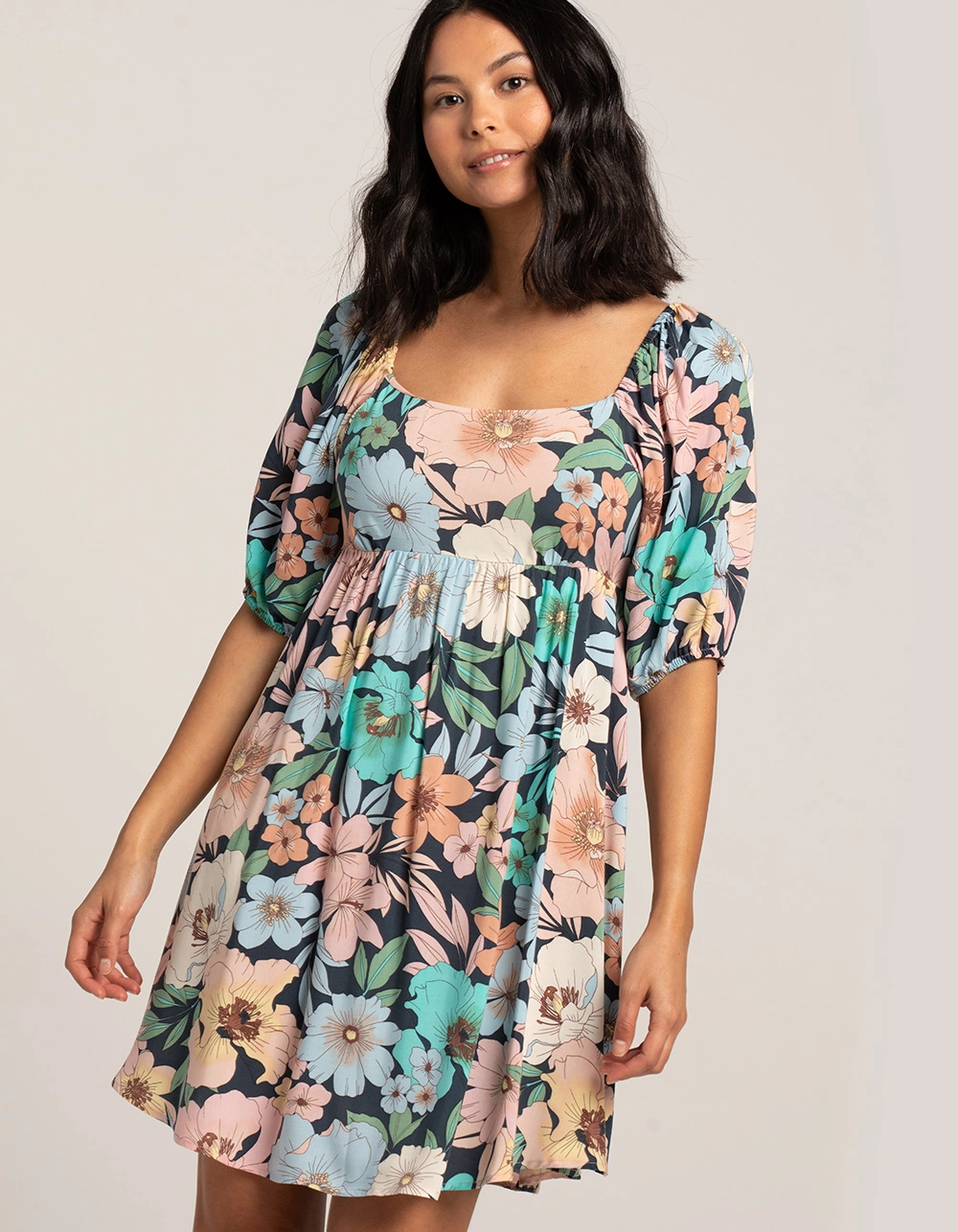 O’Neill Manda Dress. Allover floral print. Elastic waist and puff sleeves. Keyhole tie closure at back. Approx. length: 33”. 100% Viscose. Machine wash. Imported.