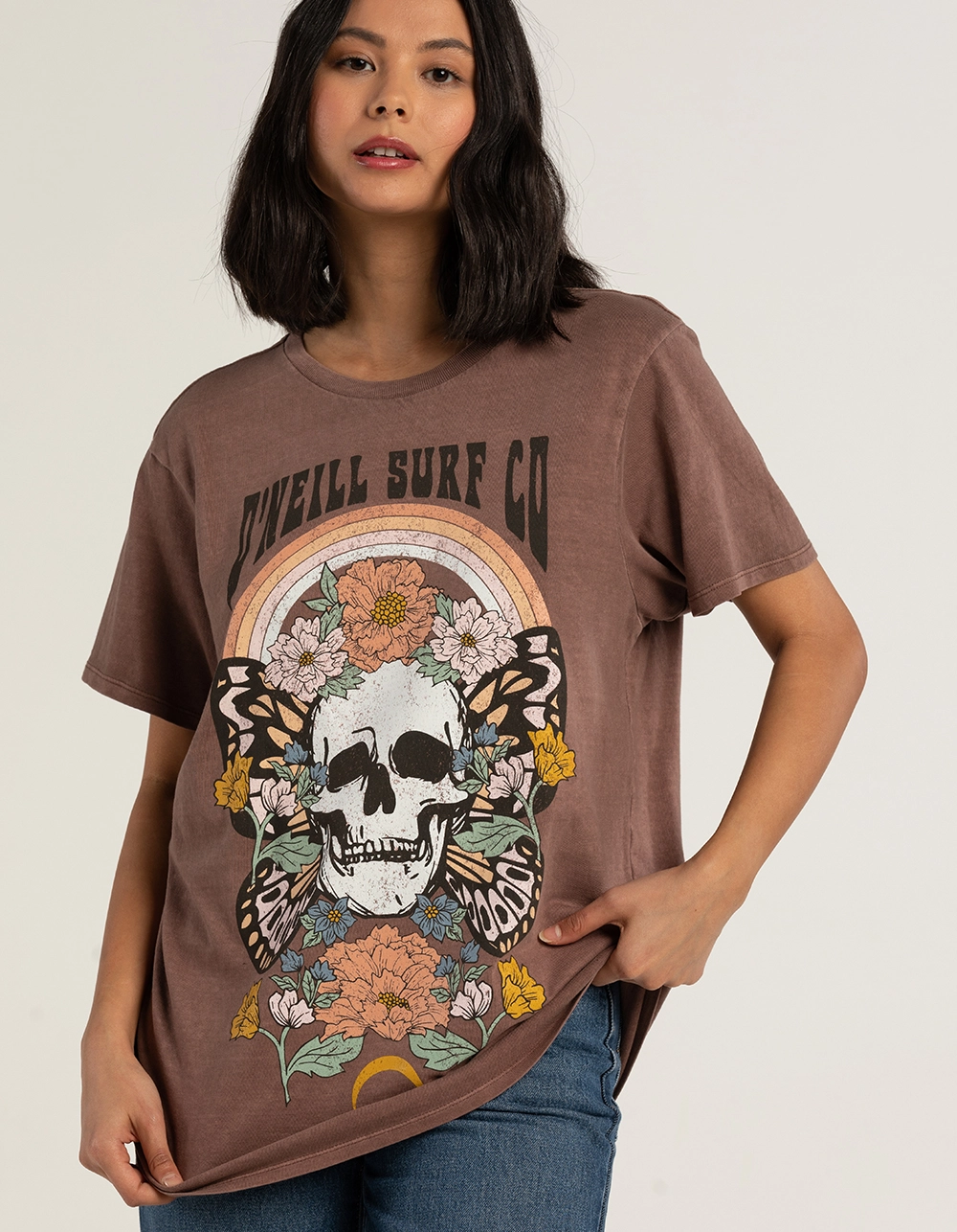 O’Neill Monarch Tee. Large graphic on front. Ribbed crew neckline. Short sleeve. Oversized fit. 100% Cotton. Machine wash. Imported.
