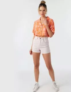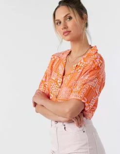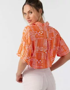 O’Neill Ophelia Button Up Crop Top. Cute and classic short sleeve top that has a front button design with collar, allover print and relaxed fit. 16″ in length. Front button closure with collar. Short sleeves. Relaxed fit. Split side seams at hem. 100% Viscose. Imported.