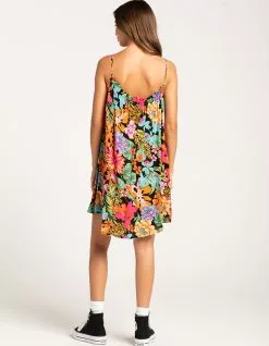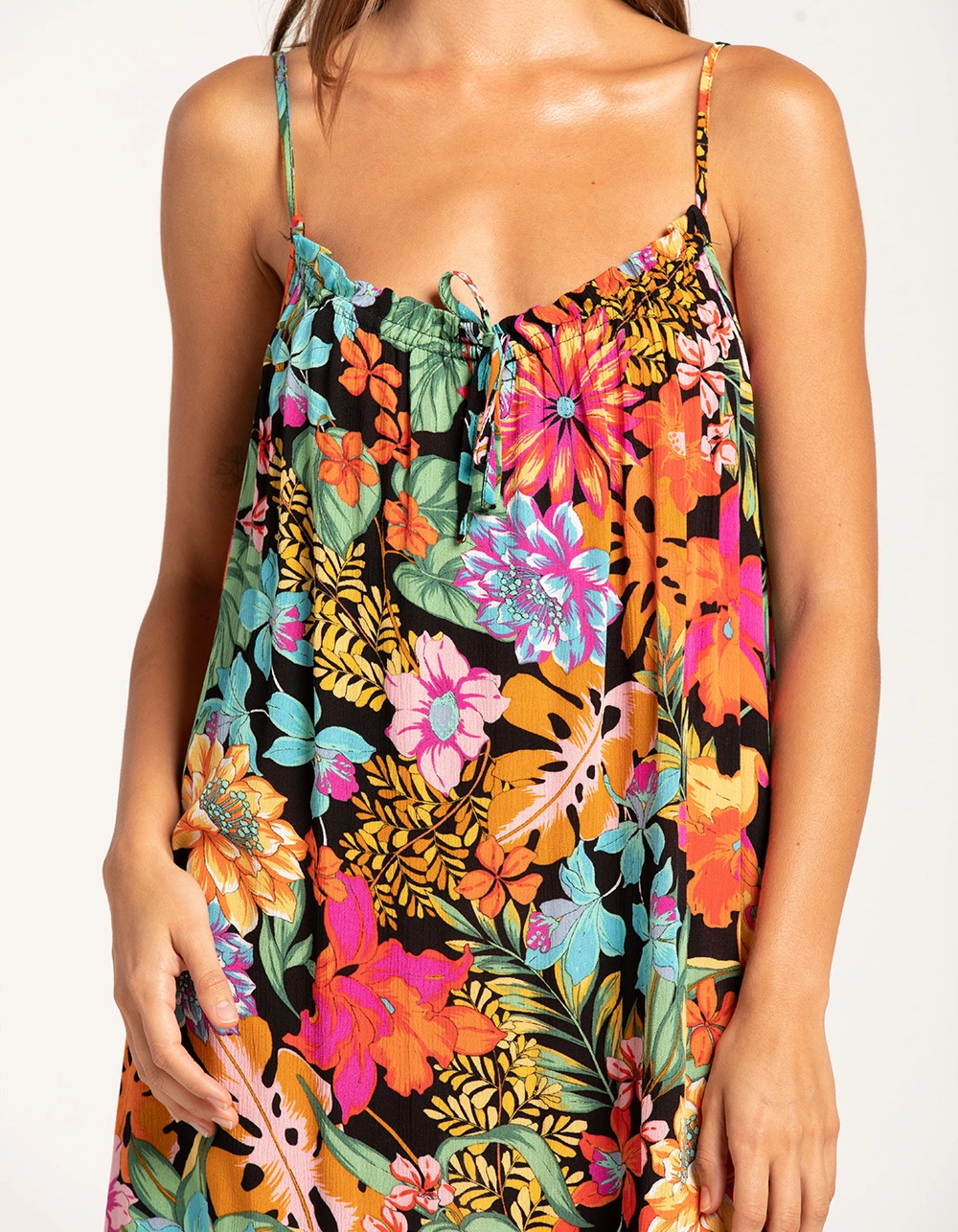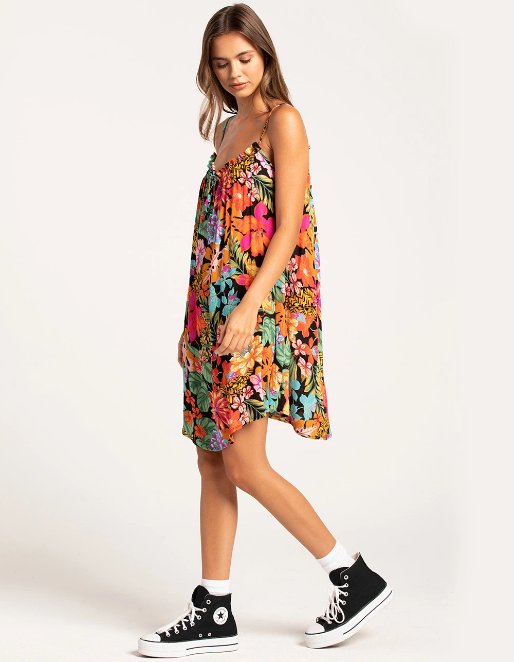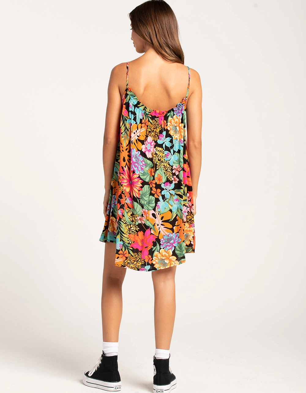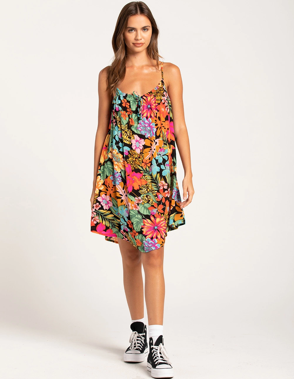 O’Neill Rainn Mini Dress. Allover vibrant print. Tunnel opening at neck. Spaghetti straps. Ruffle trim neckline. Lightweight and flowy material. Approx. length: 32”. 100% Viscose. Machine wash. Imported.