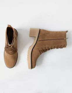 Oasis Society Jamie Hiker Boots. Leather lace closure. Side zipper closure. Suede upper. Heel tab. Gum lug sole. Moon heel. Imported.