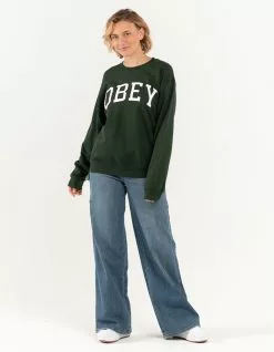 Obey Academy Crewneck Sweatshirt. Large graphic logo on front. Cuffed long sleeves and hem. Ribbed crew neckline. Long sleeves. 50% Cotton 50% Polyester. Machine wash. Imported.