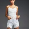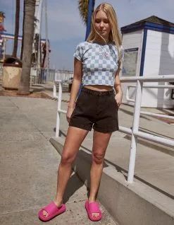 Obey Baby Lamb High Waisted Denim Shorts. Zip fly and button closure. Belt loop waist. Slant hand pockets and back patch pockets. Baby lamb embroidery on rear pocket. Approx. inseam: 3.5”. 100% Cotton. Machine wash. Imported.