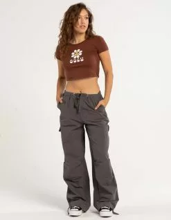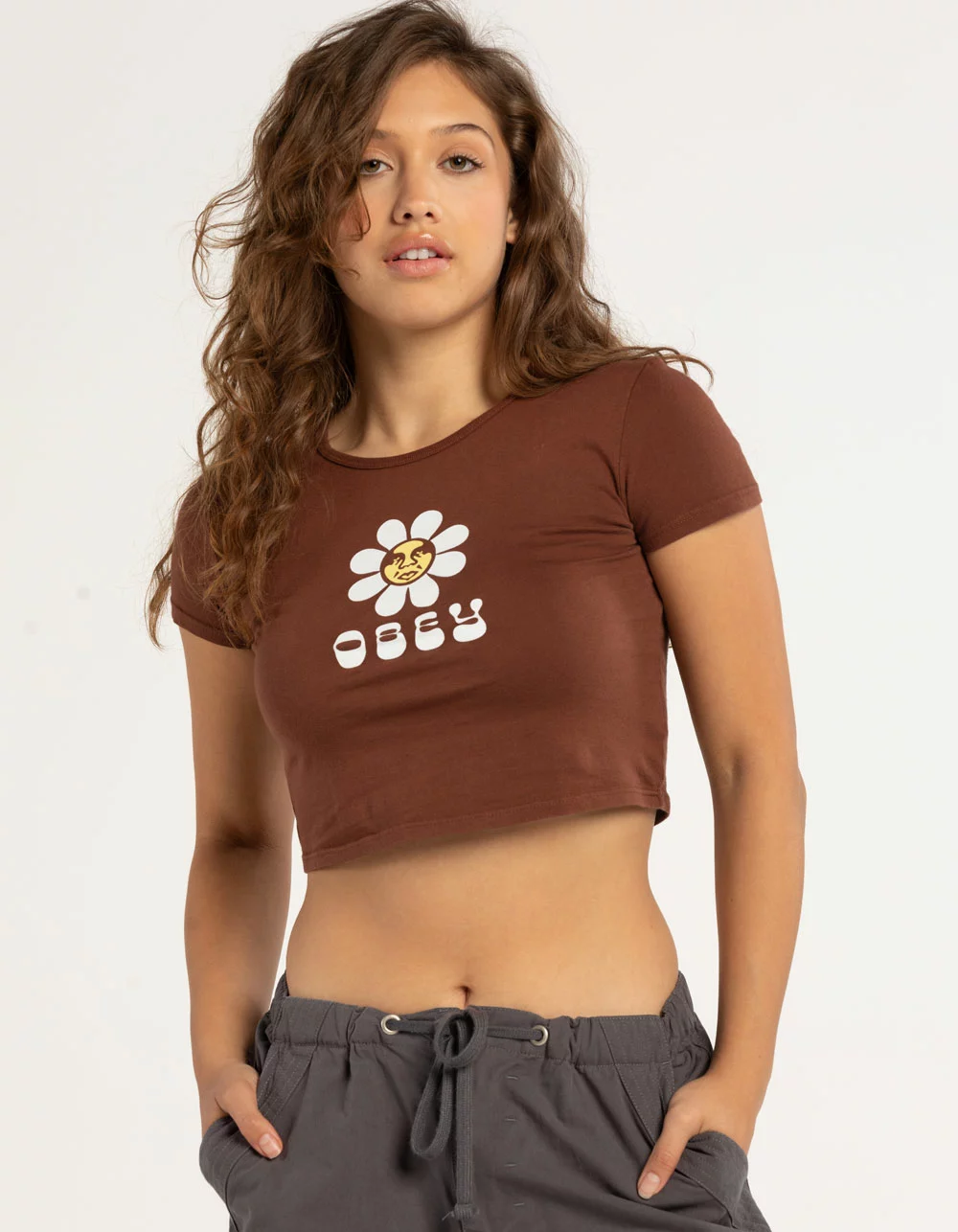 Obey Icon Flower Crop Tee. Logo graphic screened on front. Ribbed crew neckline. Short sleeve. Cropped length. 100% Cotton. Machine wash. Imported.