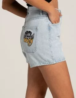 Obey Julia High Waisted Denim Shorts. Zip fly and button closure. Belt loop waist. Traditional five pocket styling. Embroidered heart on left thigh. Cherub embroidery on rear pocket. High waisted. Approx. inseam: 2.75”. 100% Cotton. Machine wash. Imported.