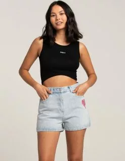 Obey Julia High Waisted Denim Shorts. Zip fly and button closure. Belt loop waist. Traditional five pocket styling. Embroidered heart on left thigh. Cherub embroidery on rear pocket. High waisted. Approx. inseam: 2.75”. 100% Cotton. Machine wash. Imported.