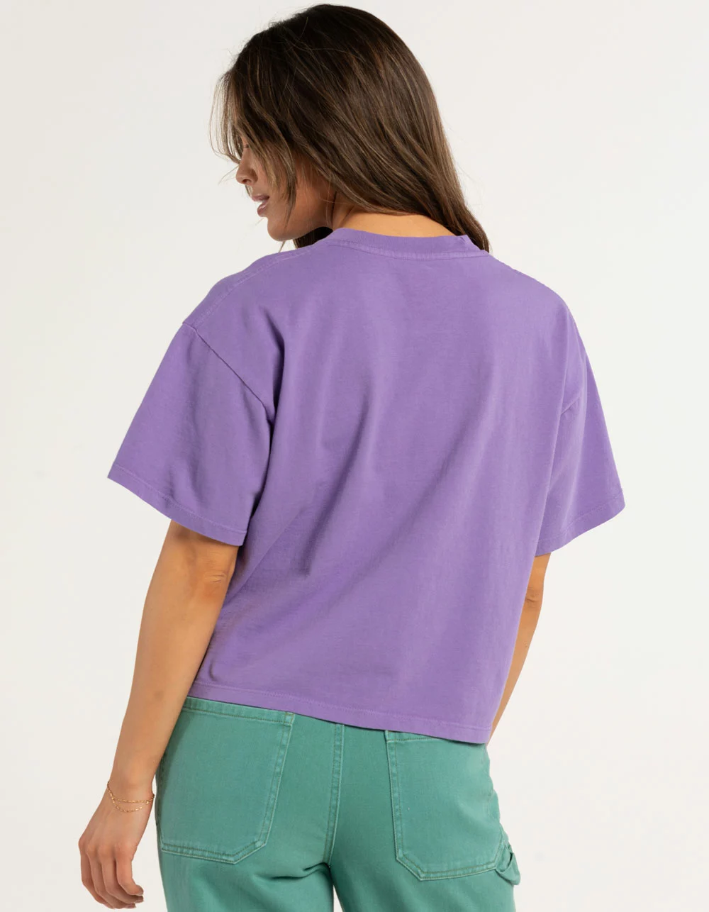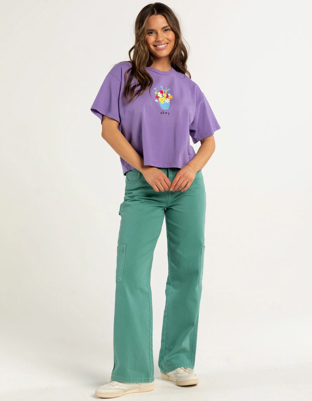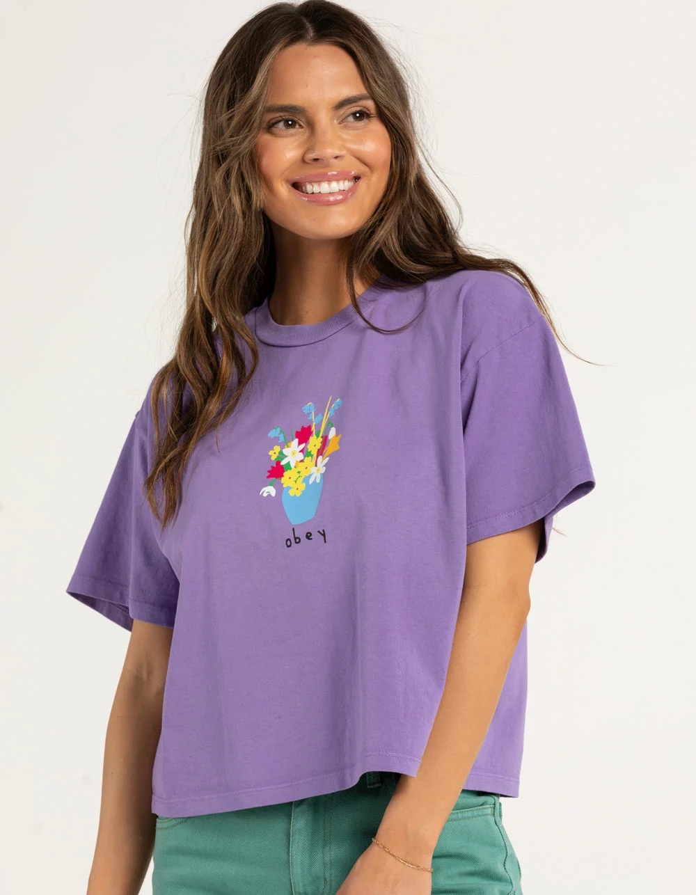 Obey Vase Bunch Crop Tee. Graphic screened on center chest. Ribbed crew neckline. Short sleeve. Loose fit. Cropped. 100% Cotton. Machine wash. Imported.