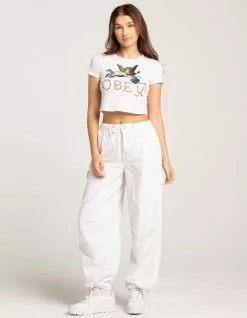 Obey Watering Can Cherub Crop Tee. Large logo and cherub graphic screened on front. Ribbed crew neckline. Short sleeve. Cropped fit. 100% Cotton. Machine wash. Imported.