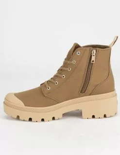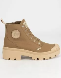 Palladium Pallabase Twill Boots. The Pallabase Twill boot brings our iconic Pampa to a higher level. A feminine boot with a higher heel and Palladium DNA, including the iconic rubber toecap. A protective and stylish cuff makes this boot a great addition to your city outfit. Cotton twill upper. Cotton canvas lining. Die-cut EVA + EVA cup sock liner. Woven label at tongue. Round rubber patch on lateral quarter. Woven label on lateral side. Zipper at medial side. Lace up. Tongue loop. Textile heel loop. 100% cotton. Imported.