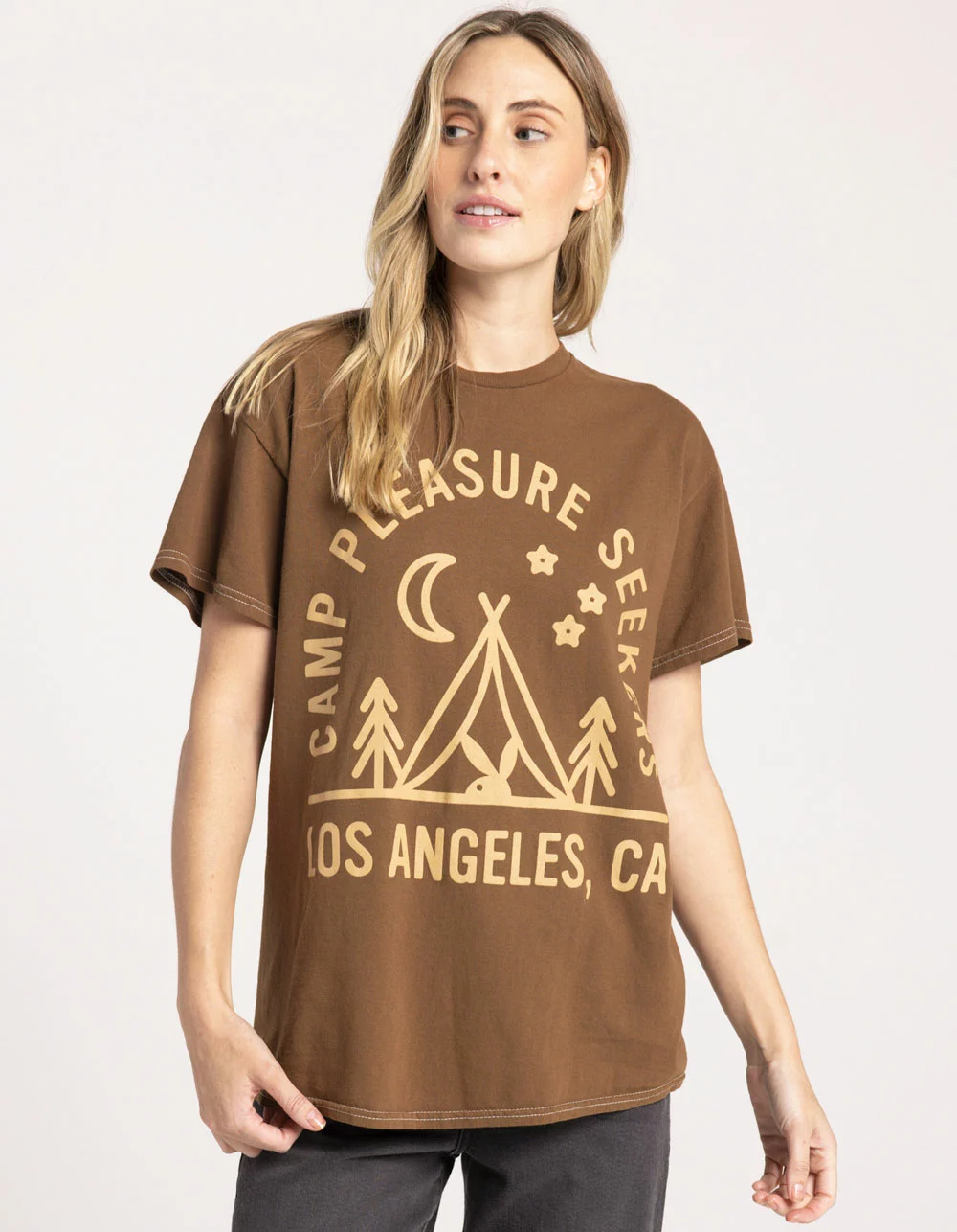 Playboy Camp Tee. Large graphic on front. Contrast stitching. Ribbed crew neckline. Short sleeve. Oversized fit. 100% Cotton. Machine wash.