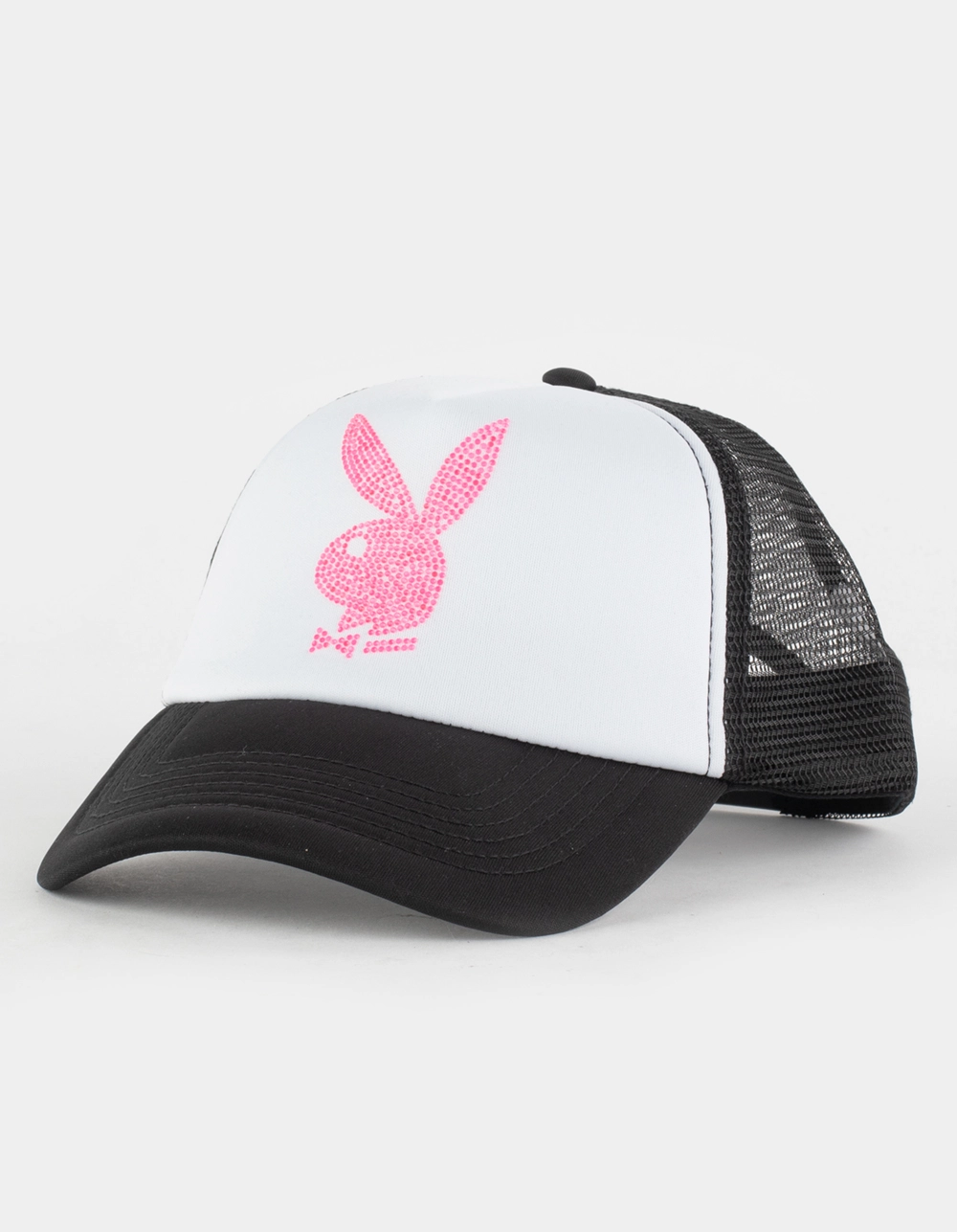 Playboy Rhinestone Womens Trucker Hat. Trucker Hat. Rhinestone logo on front. Foam front panel. Mesh back. Adjustable snapback. Woven Label on closure. 100% Polyester. Imported.