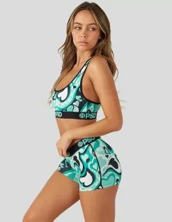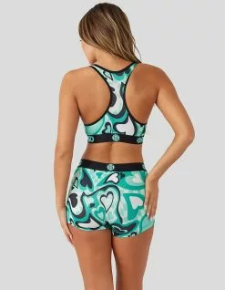 PSD Queen Of Hearts Sports Bra. High profile comfort band. Active stretch fabric. Microfiber Blend. Racer back straps. 88% Polyester 12% Elastane. Machine wash. Imported.