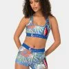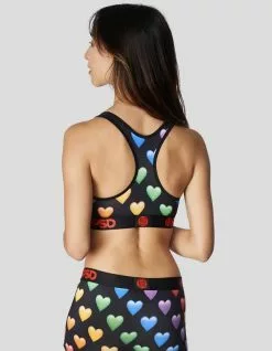 PSD Rainbow Heart Sports Bra. High profile comfort band. Active stretch fabric. Microfiber Blend. Racer back straps. Breathable, ultralight, and soft to the touch polyester blend fabric. 88% Polyester 12% Elastane. Machine wash. Imported.