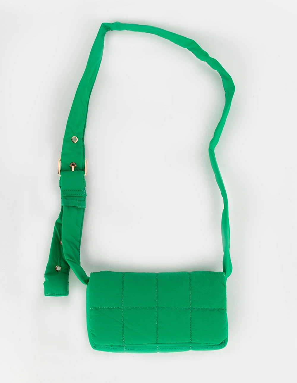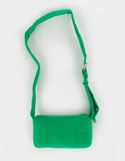 Puffer Crossbody Bag. Nylon puffer bag. Magnetic button closure. Interior organizational pocket. Adjustable shoulder strap with gold toned eyelets. 8.5”W x 4.5”H x 2.25”D. Shell: 100% Nylon. Lining: 100% Polyester. Imported.