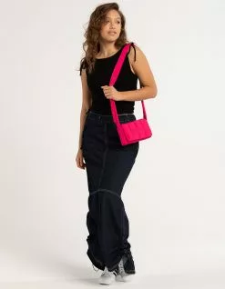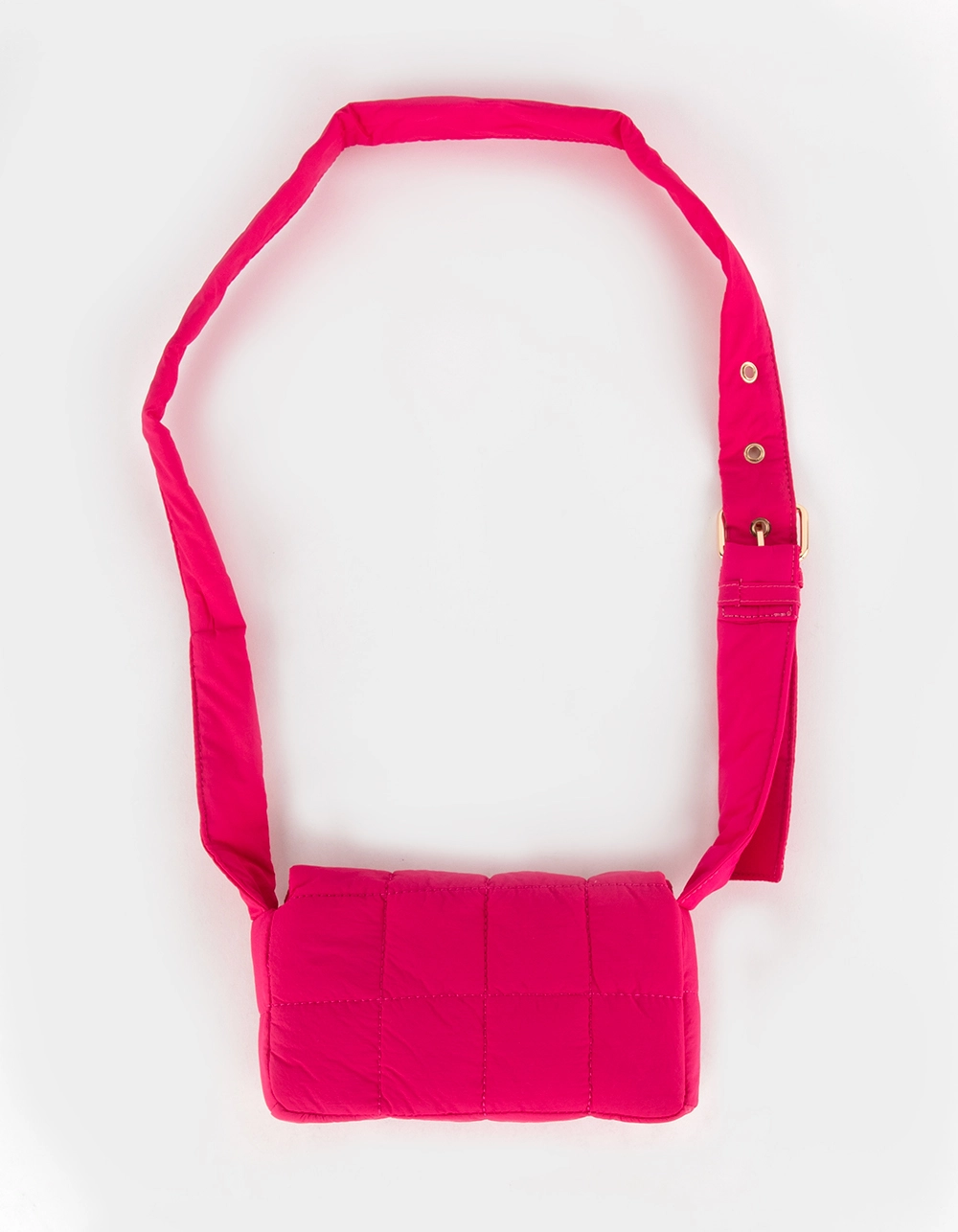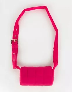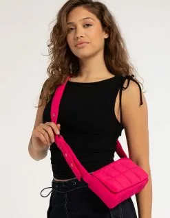 Puffer Crossbody Bag. Nylon puffer bag. Magnetic button closure. Interior organizational pocket. Adjustable shoulder strap with gold toned eyelets. 8.5”W x 4.5”H x 2.25”D. Shell: 100% Nylon. Lining: 100% Polyester. Imported.