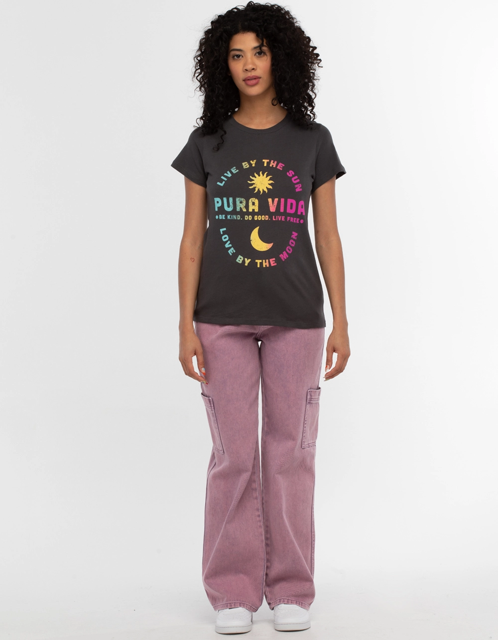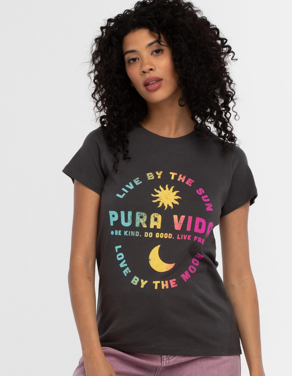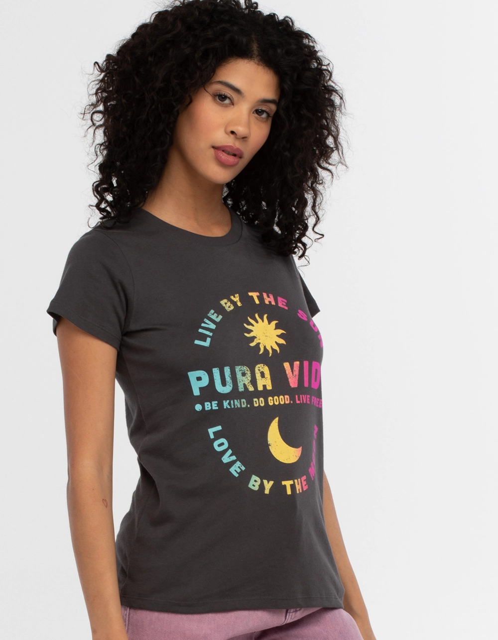 Pura Vida Live By The Sun Womens Tee. Graphic on front. Ribbed crew neckline. Short sleeves. 100% Organic cotton. Machine wash. Imported.