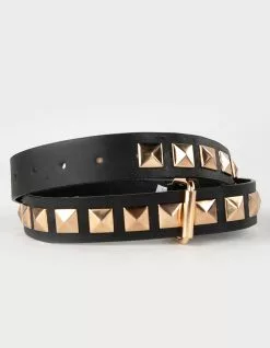 Pyramid Stud Belt. Black PU leather belt featuring a single row of pyramid shaped studs. Gold toned studs and buckle. Approx. width: 1.5”. Buckle: 100% Alloy Metal. Belt: 100% Polyurethane. Imported.