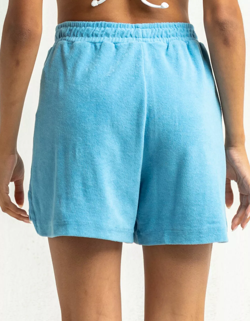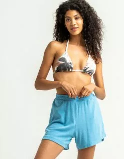 Quiksilver Holiday Spot Shorts. Elastic waistband. Looped towel fabric. Pigment garment dye. Embroidered logo above front left hem. Approx. inseam: 4.5″. 70% cotton/30% polyester. Machine wash. Imported.