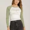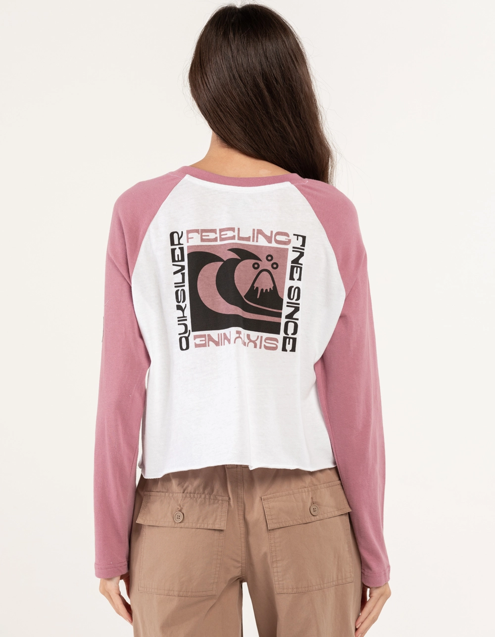 Quiksilver Raglan Crop Tee. Graphic on left chest. Large graphic on back. Ribbed crew neckline. Raglan sleeves. Crop hem. 80% Cotton 20% Polyester. Machine wash. Imported.