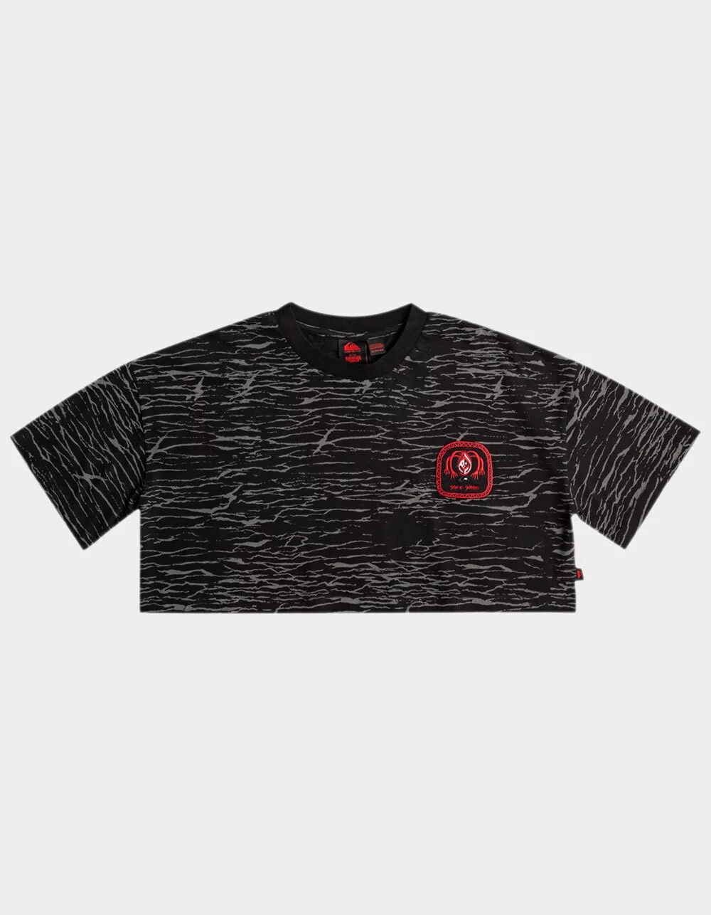 Quiksilver x Stranger Things Upside Down Womens Crop Tee. We teamed up with Stranger Things to crack open our 1986 time capsule. And what we discovered was totally tubular. Tiny tops, hyper colors, and sick logos galore. The Upside Down Cropped T-shirt gives you the very best of these epic times, and no matter if you’re team Hellfire or Lenora Hills, these are true collector’s items for hardcore fans. Super rad with a vintage wash and a belly-bearing hem for an authentic retro vibe, these limited edition tees launch your style into another dimension. Allover print. Embroidery on left chest. Crop hem. Ribbed crew neckline. 100% Cotton. Machine Wash. Imported.