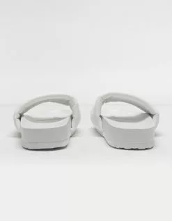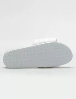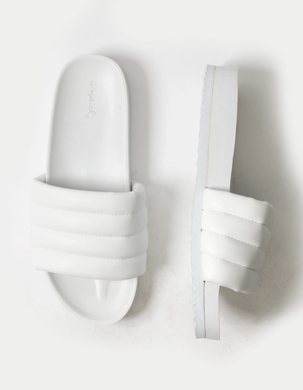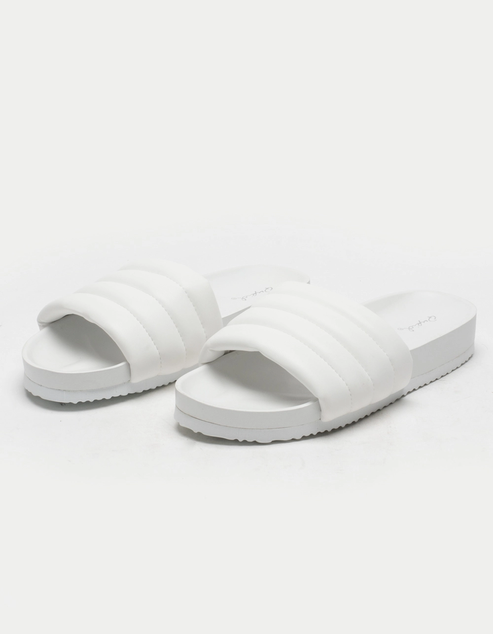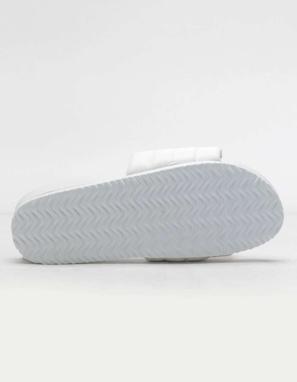 Qupid Quilted Womens Slide Sandals. Thick sole. Wide quilted padded strap. Molded footbed. Rubber sole. Wavy Sole for traction. Imported