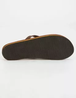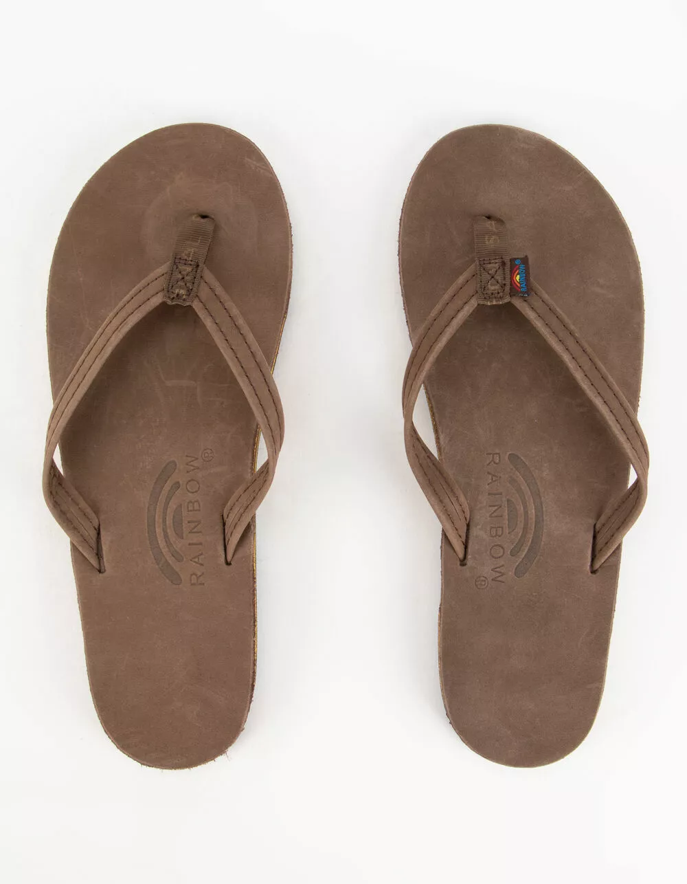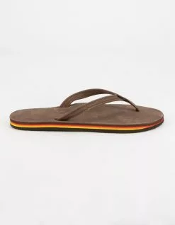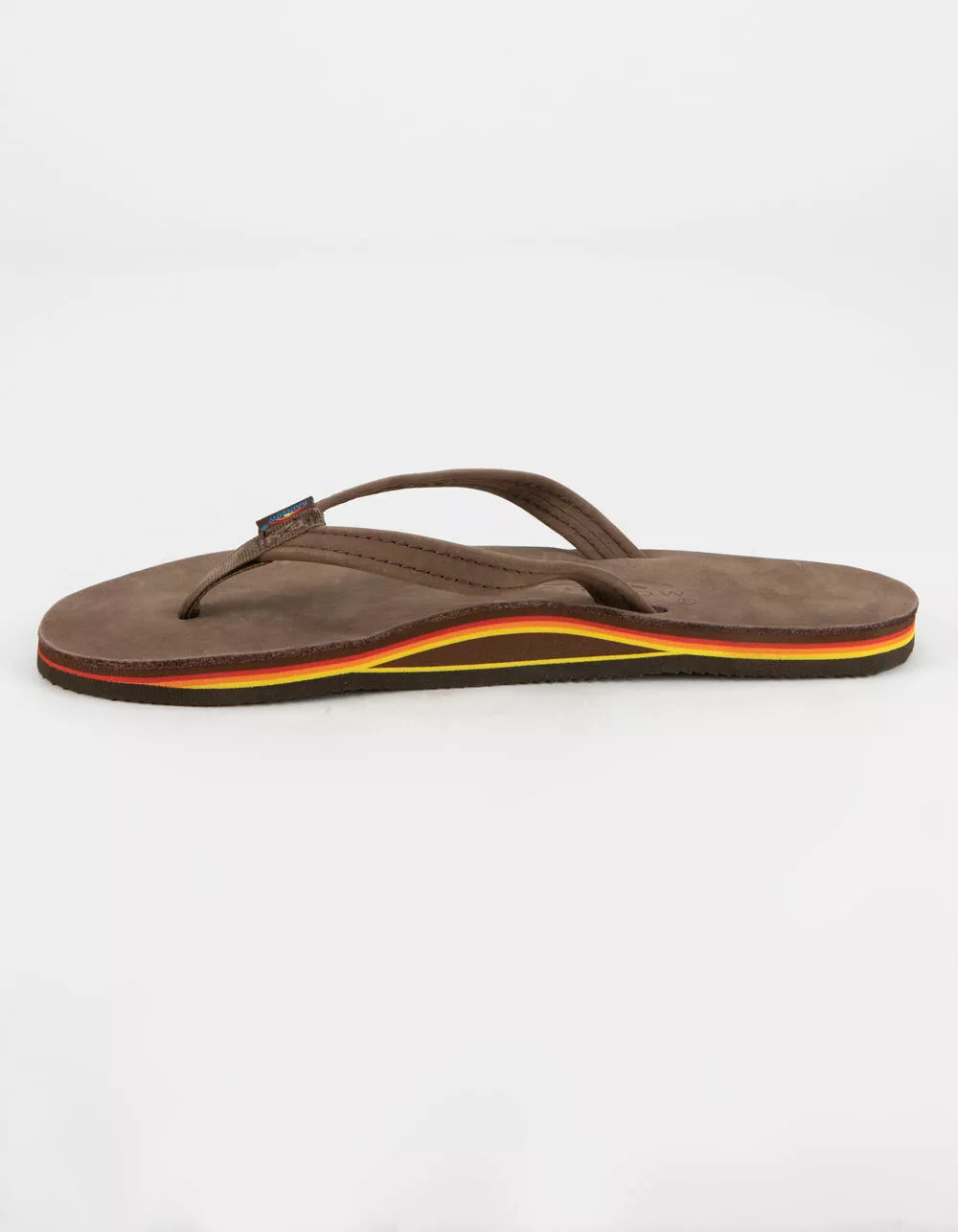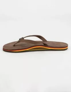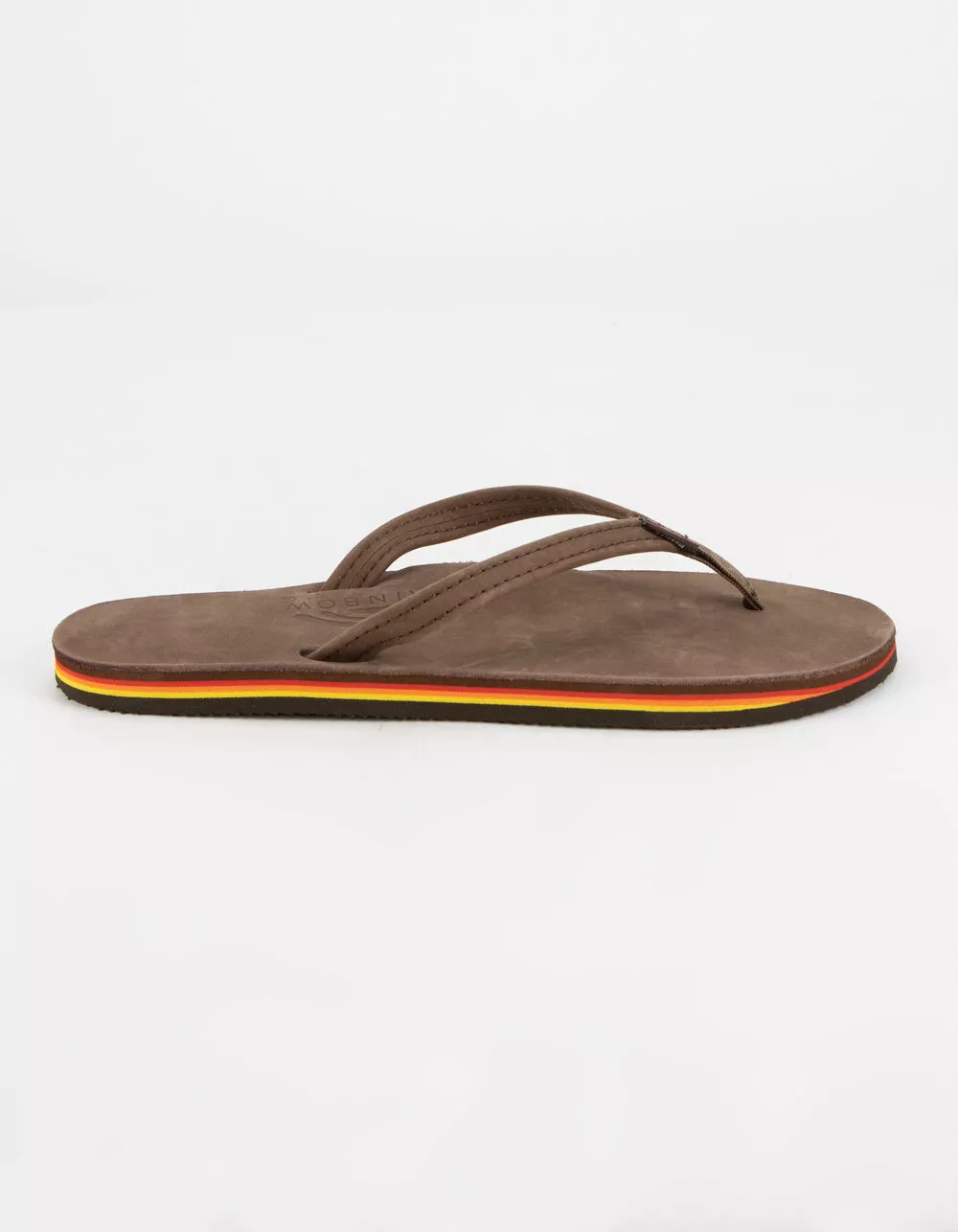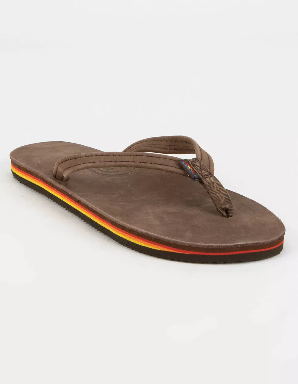 Rainbow Narrow Strap flip-flop. The original leather sandal. Features thin leather and nylon straps. Soft leather-lined EVA sole with arch support. Rubber outsole. Embossed Rainbow logo on footbed. Rainbow label on straps. Imported.