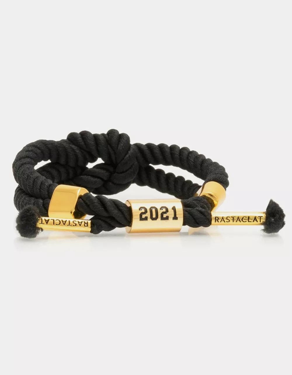 Rastaclat 2021 Gradclat Braided Bracelet. Knotted style designed with black rope to mimic cap & gown. Features gold enamel hardware and contrast 2021 emblems. Fits 6″ – 7.5″ wrist. 100% polyester. Imported.