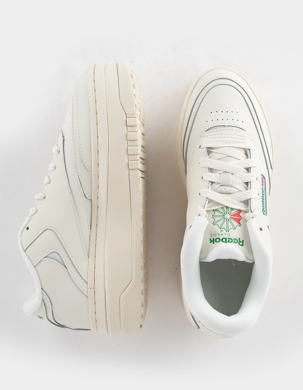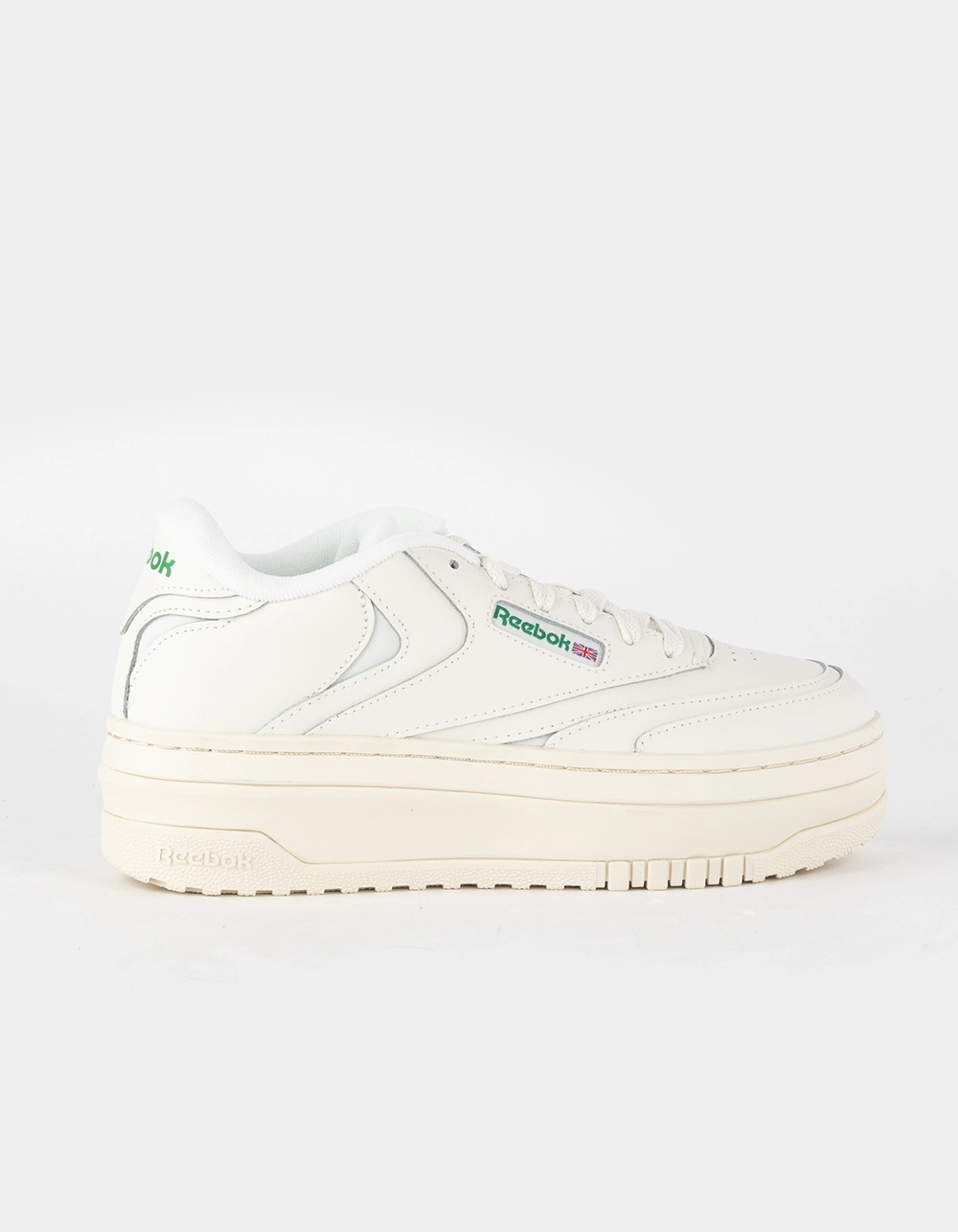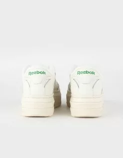 Reedbok Club C Extra Shoes. Being extra is a good thing. These women’s Club C Extra shoes prove it. An exaggerated platform midsole with a geometric design gives you an amplified look. Don’t miss the outsole which has a 3D tennis racket effect. Subtle hits of iconic color on the leather upper seal the deal. Leather upper with nylon pops. Lace closure. EVA midsole. Terry cloth tongue and collar. Textured rubber outsole. Imported.