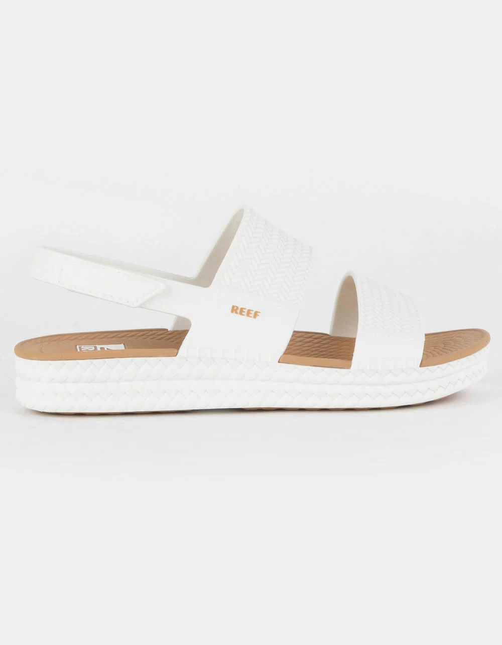 Reef Water Vista Sandals. Sunrise yoga or sunset drinks? These sandals are on point anywhere. Water friendly straps with an espadrille inspired texture makes them quick to dry and comfy when wet. The dual density footbed supports your stride, and a velcro backstrap ensures perfect fit. Top sole is super soft and bouncy with great rebound for all day comfort. The outsole is harder and durable to withstand all types of terrain and elements. Imported.