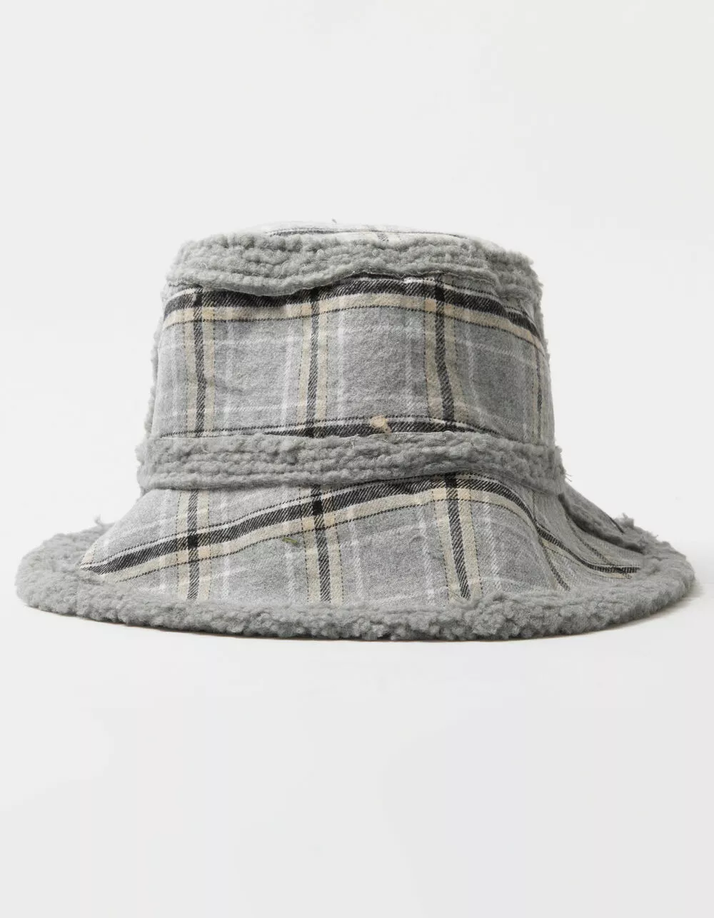 Reversible Plaid/Sherpa Bucket Hat. Plaid Print. Sherpa detail. Reversible. Imported.
