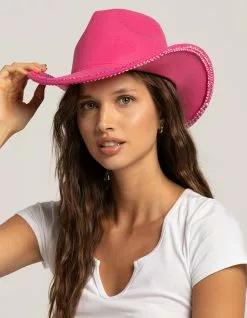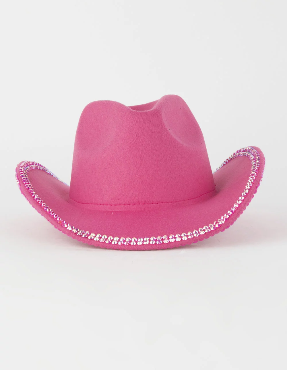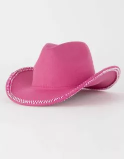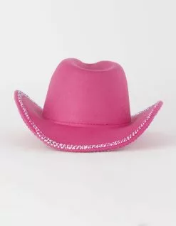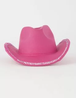Rhinestone Cowboy Hat. High crown. Adjustable strap inside. Rhinestone detailing on top and underside of brim. 100% Polyester. Hand wash. Imported.