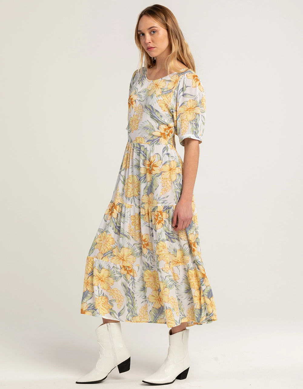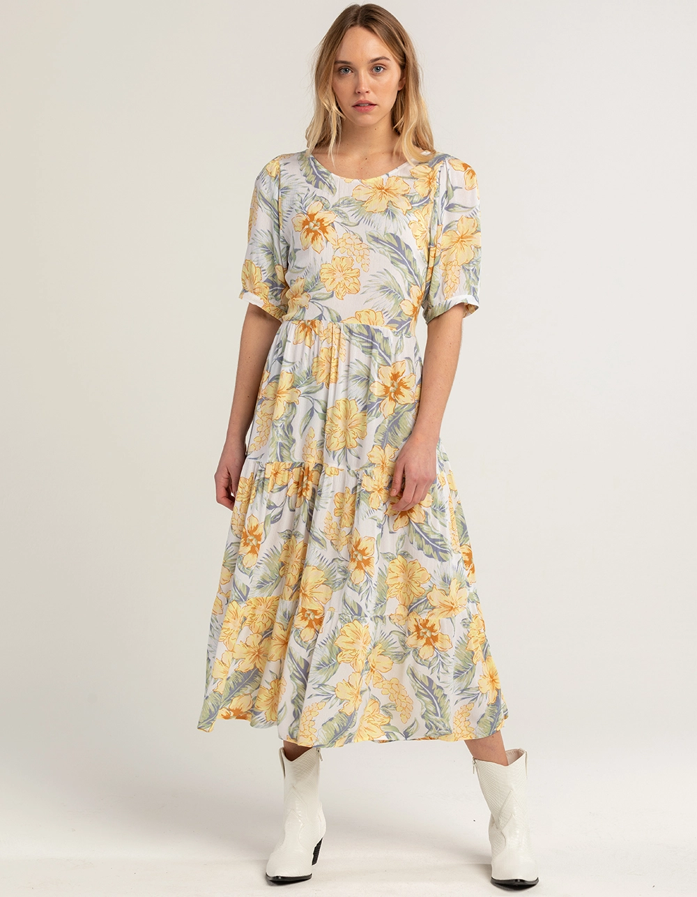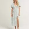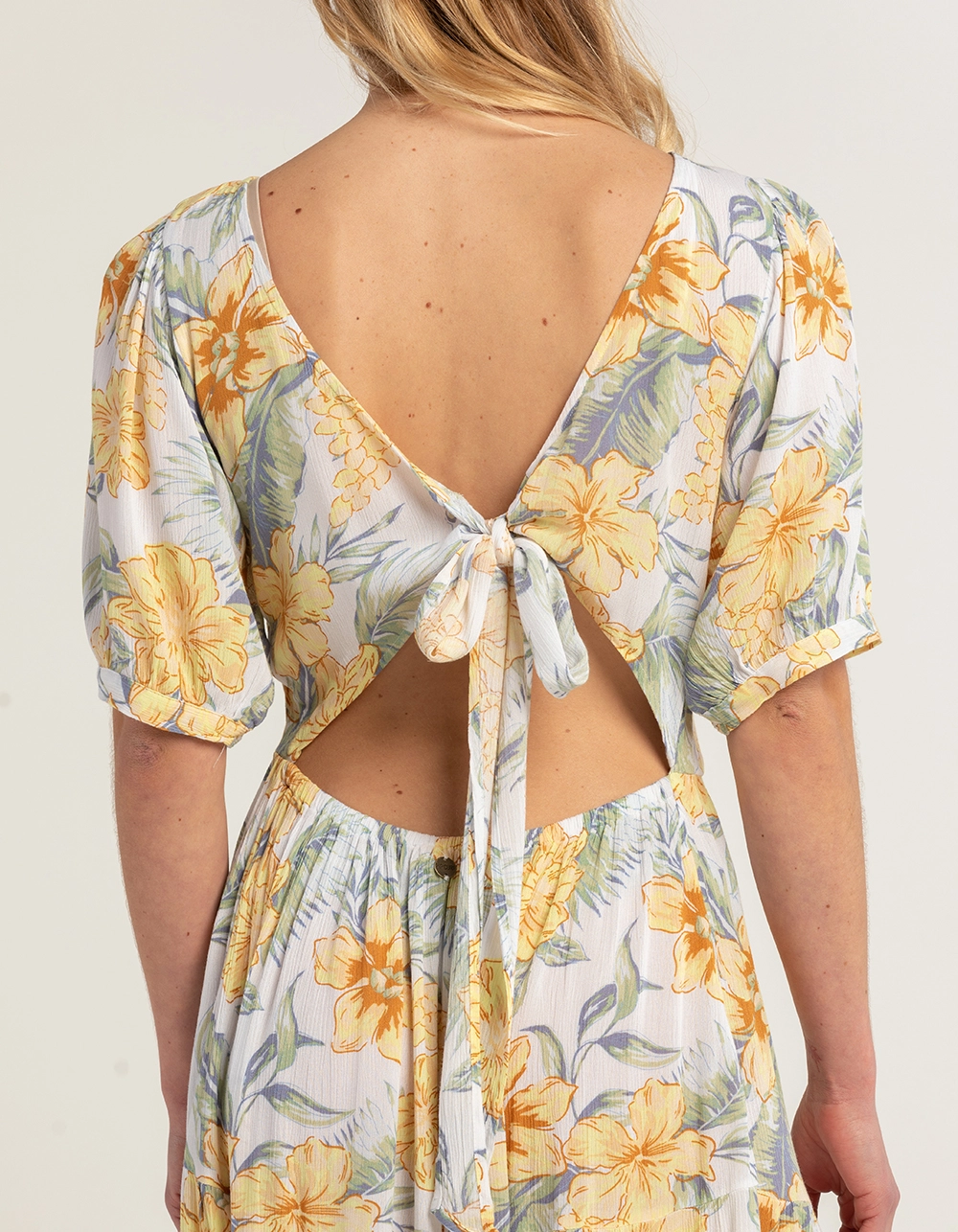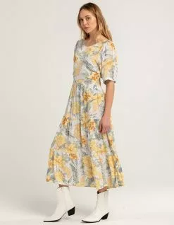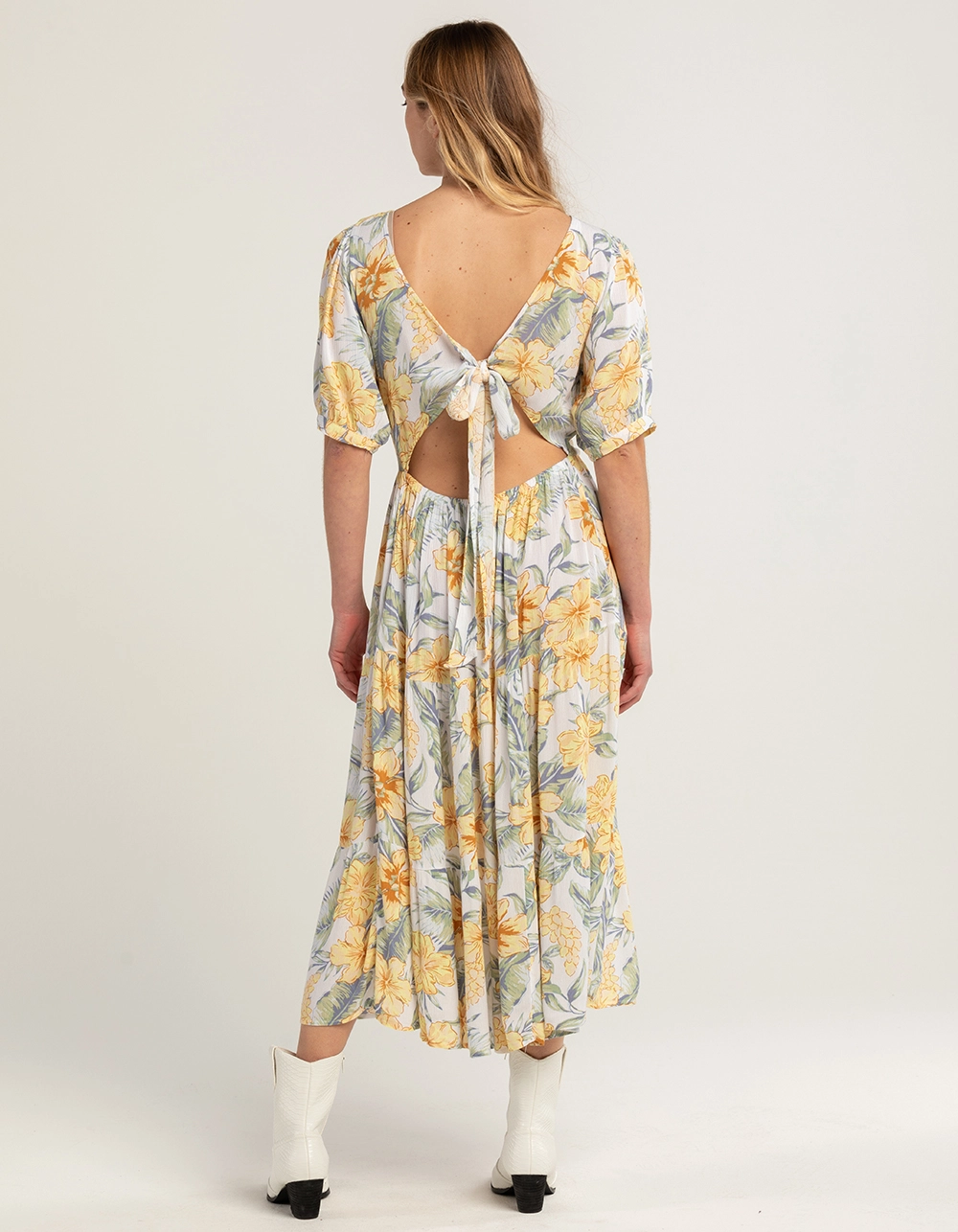 Rip Curl Always Summer Midi Dress. Allover floral print. Scoop neckline. Partially exposed back. Ties at back. Cuffed short sleeves. Approx. length: 50”. 100% Viscose. Machine wash. Imported.