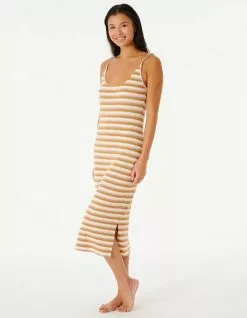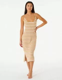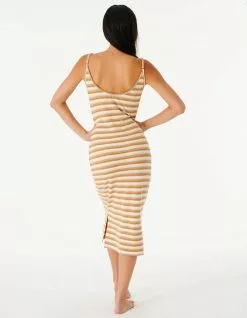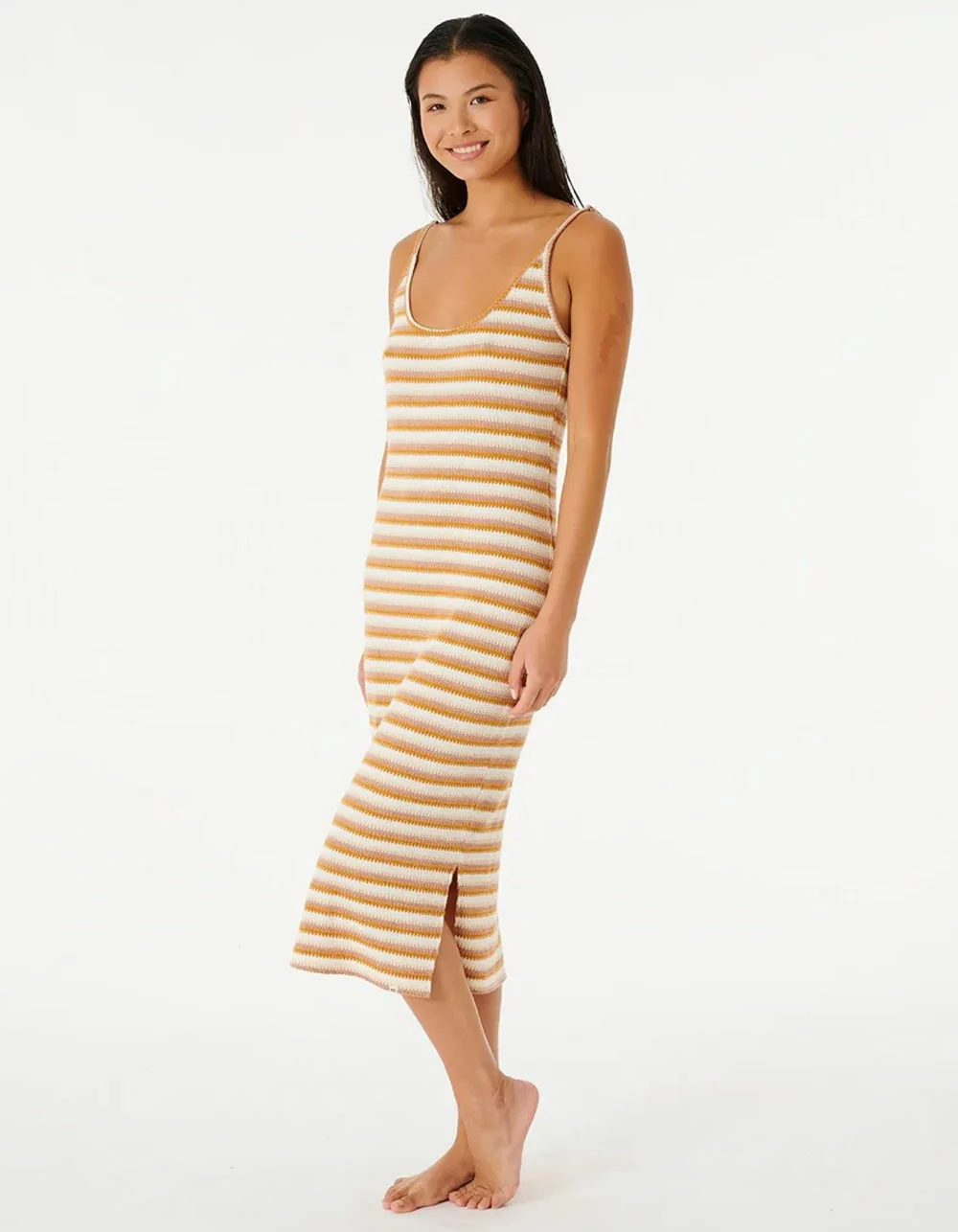 Rip Curl Bobbi Stripe Midi Dress. The Bobbi Stripe Midi Dress is a cute, fashion beach piece made from a yarn dye stripe fabric, standard fit and fully adjustable straps. Logo clamp label. 70% Polyester 29% Viscose 1% Elastane. Machine wash. Imported.
