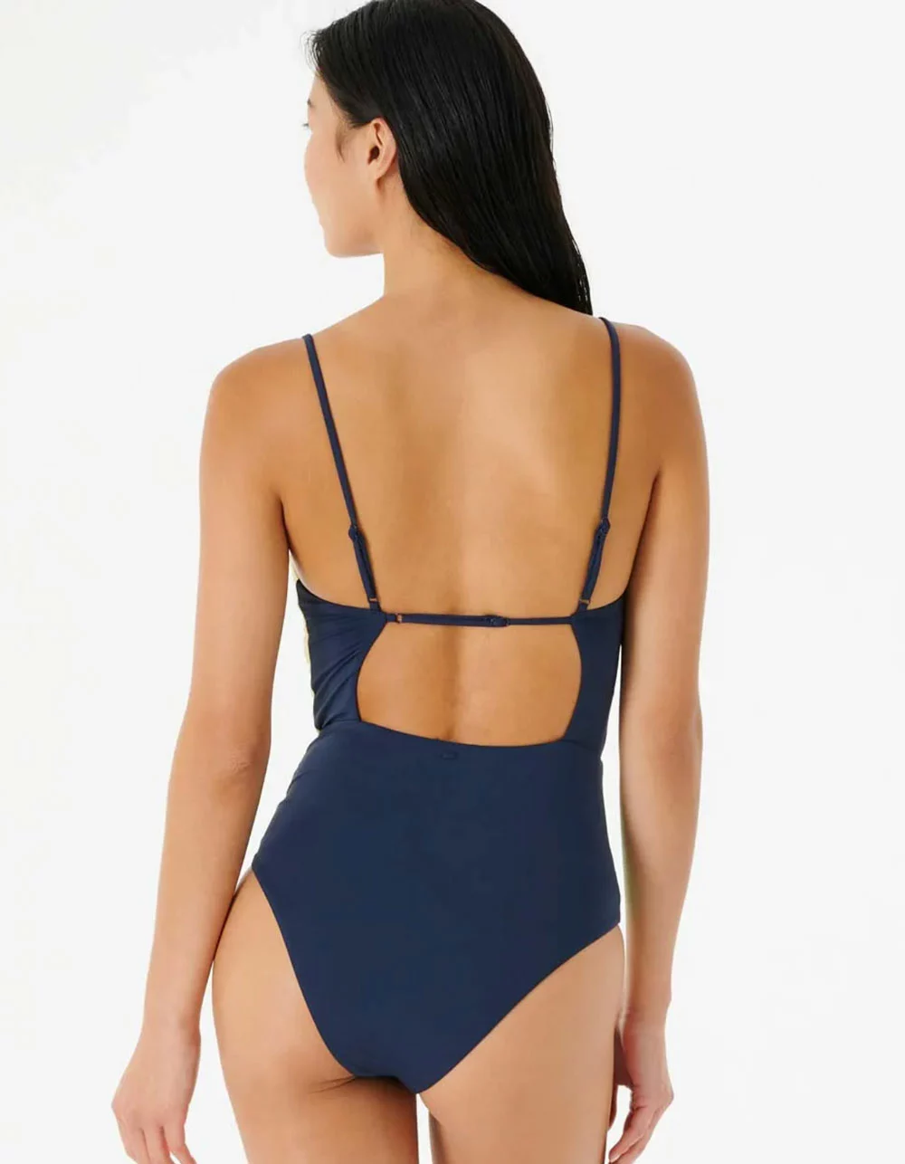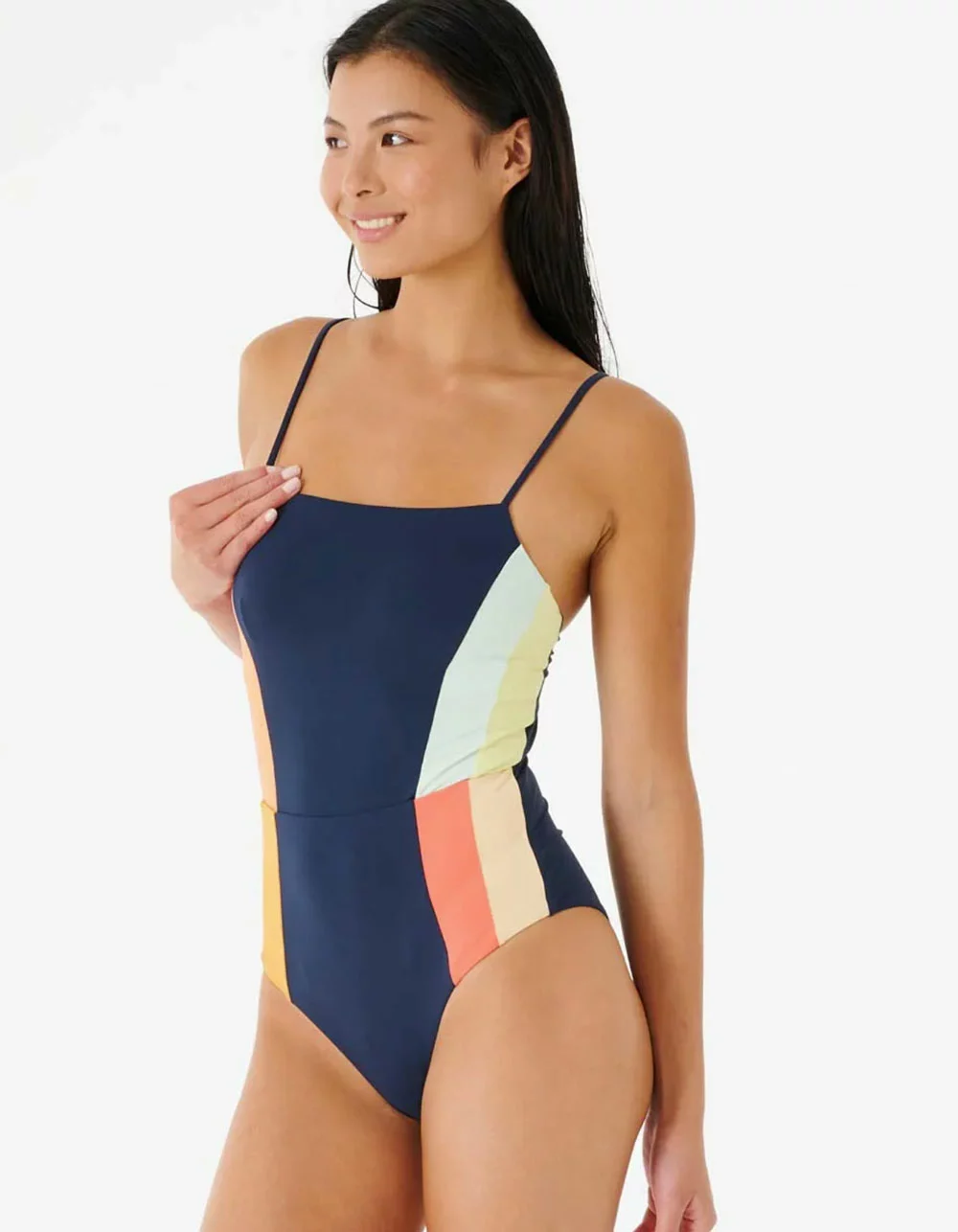 Rip Curl Day Break One Piece Swimsuit. Day Break, the latest in the Surf Revival collection, consists of statement pieces bursting with a bold, new color palette. The Day Break One Piece is a flattering one piece made from Extra Life Microfiber Lycra for longer lasting wear and comfort. Complete with an internal shelf bra, fully adjustable straps, good support and good coverage. 85% Polyamide 15% Elastane. Hand wash. Imported.
